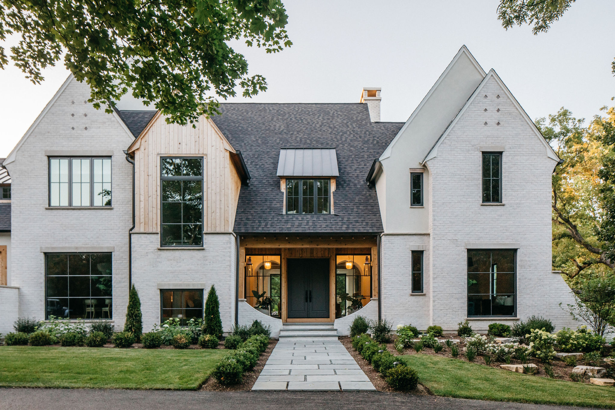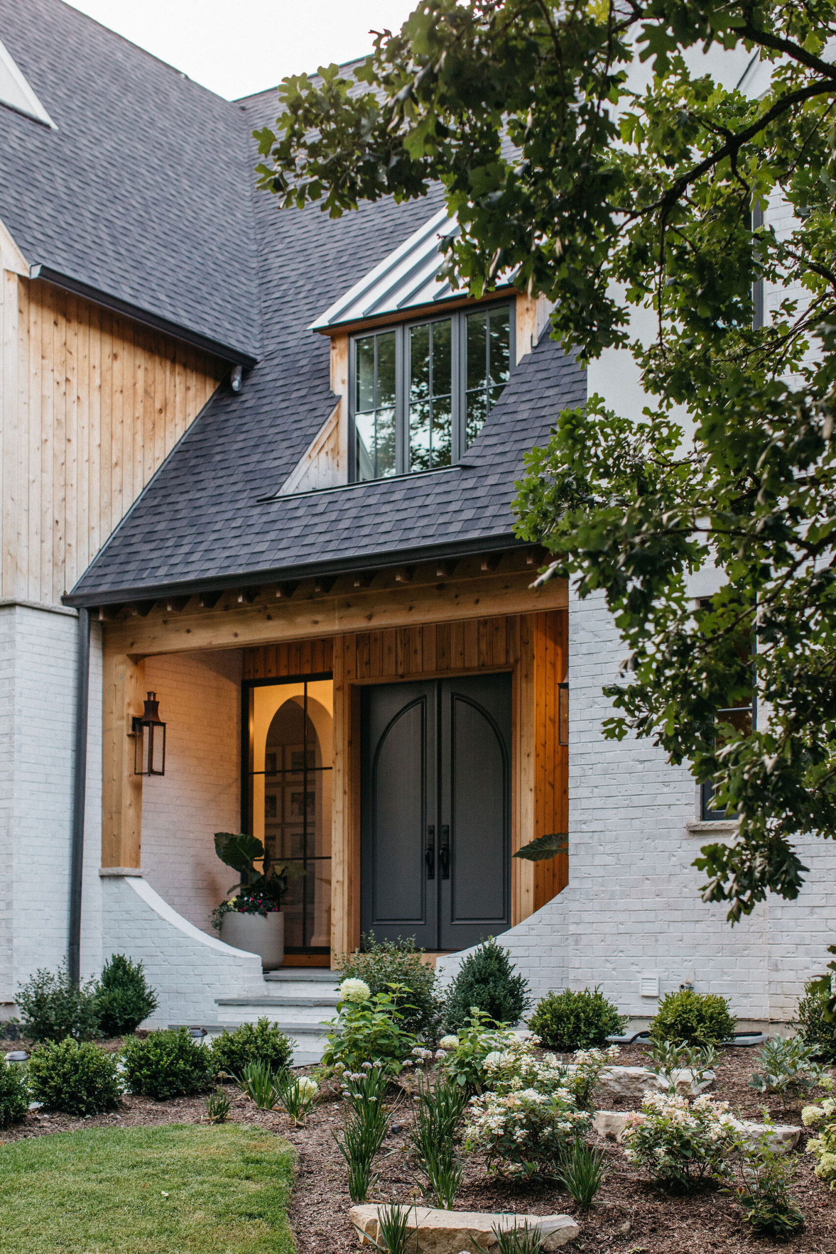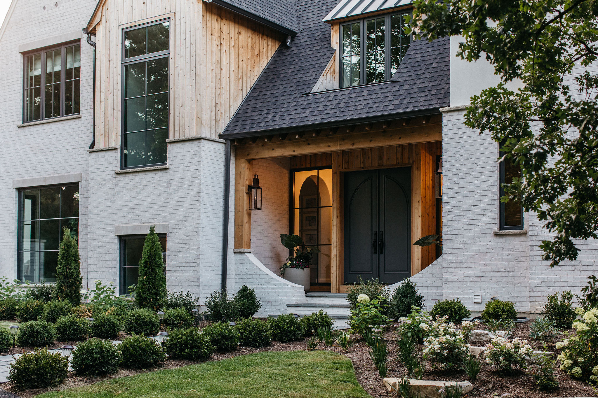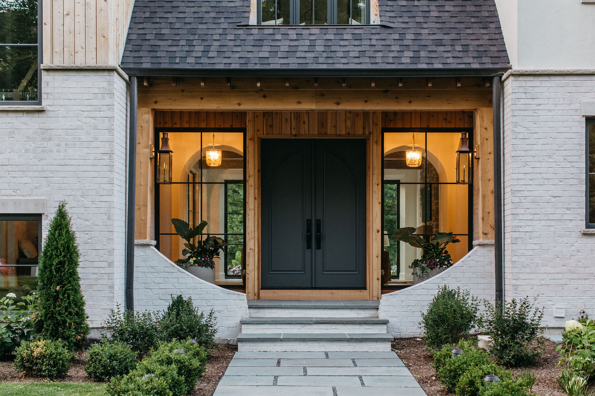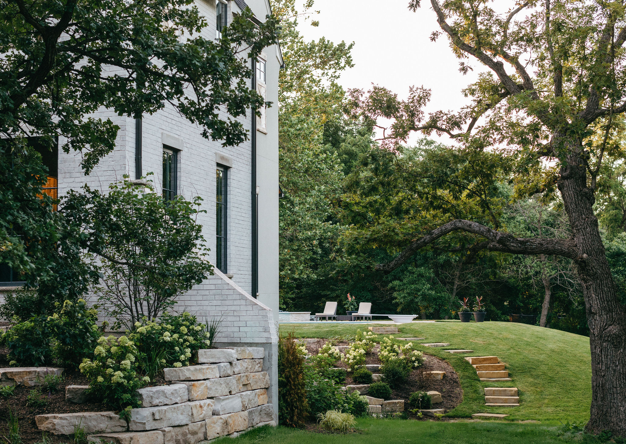 This refined estate, showcasing striking white brick and wood accents, was elevated with bespoke landscape design by Milieu Landscaping, a premier provider of landscaping services for the Northwest Suburbs and North Shore of Chicago. The front of the home is defined by an elegant, formal approach, featuring a broad stone walkway that enhances curb appeal and provides a welcoming entrance. The entire perimeter is softened by carefully structured foundation plantings, which frame the architecture and utilize layered textures and colors to provide visual interest throughout the growing season.