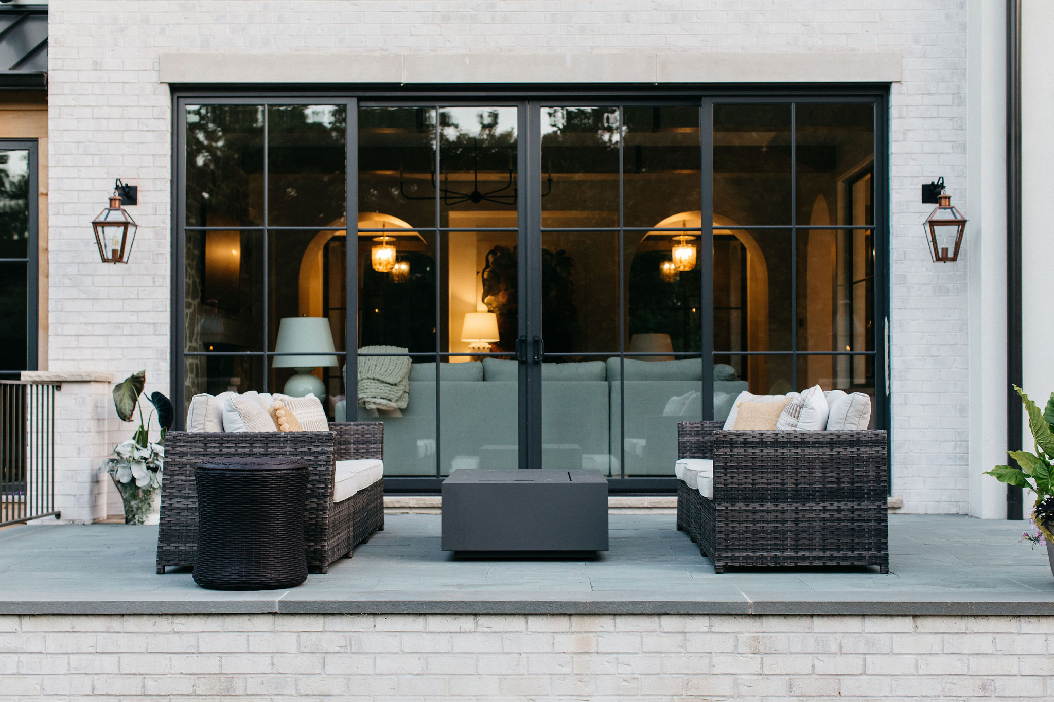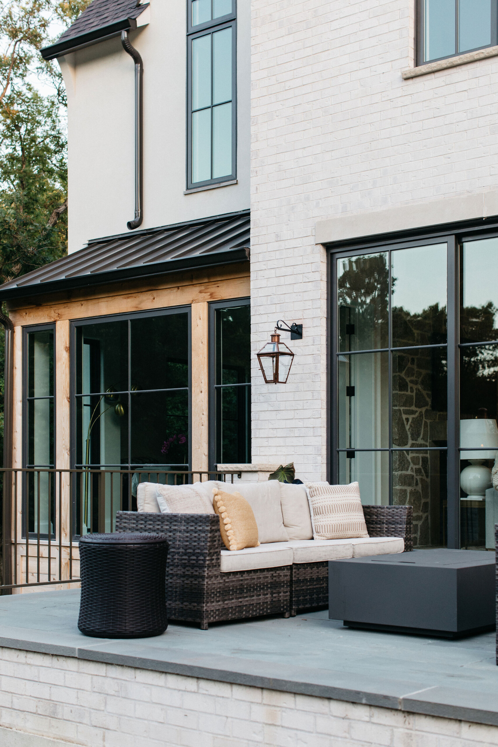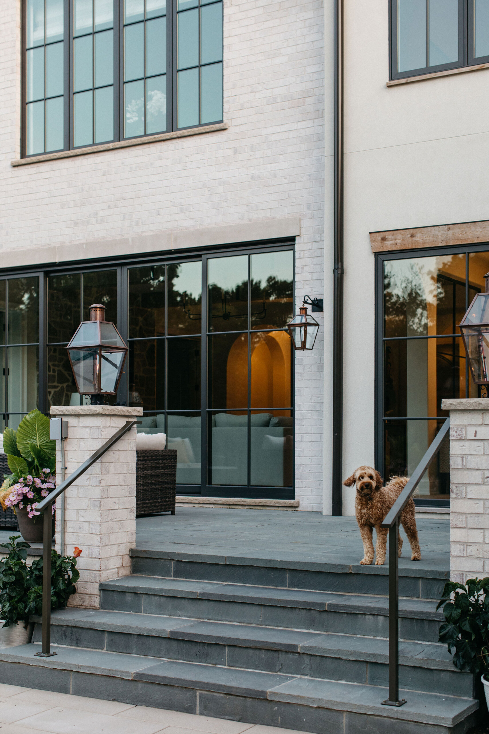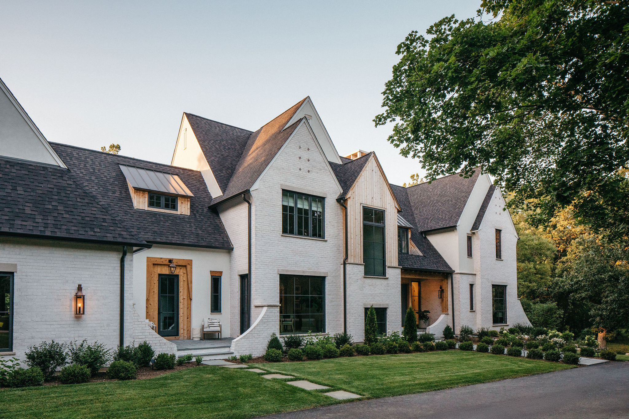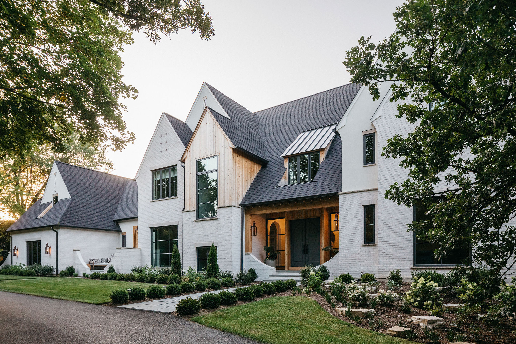 This refined estate, showcasing striking white brick and wood accents, was elevated with bespoke landscape design by Milieu Landscaping, a premier provider of landscaping services for the Northwest Suburbs and North Shore of Chicago. The front of the home is defined by an elegant, formal approach, featuring a broad stone walkway that enhances curb appeal and provides a welcoming entrance. The entire perimeter is softened by carefully structured foundation plantings, which frame the architecture and utilize layered textures and colors to provide visual interest throughout the growing season.