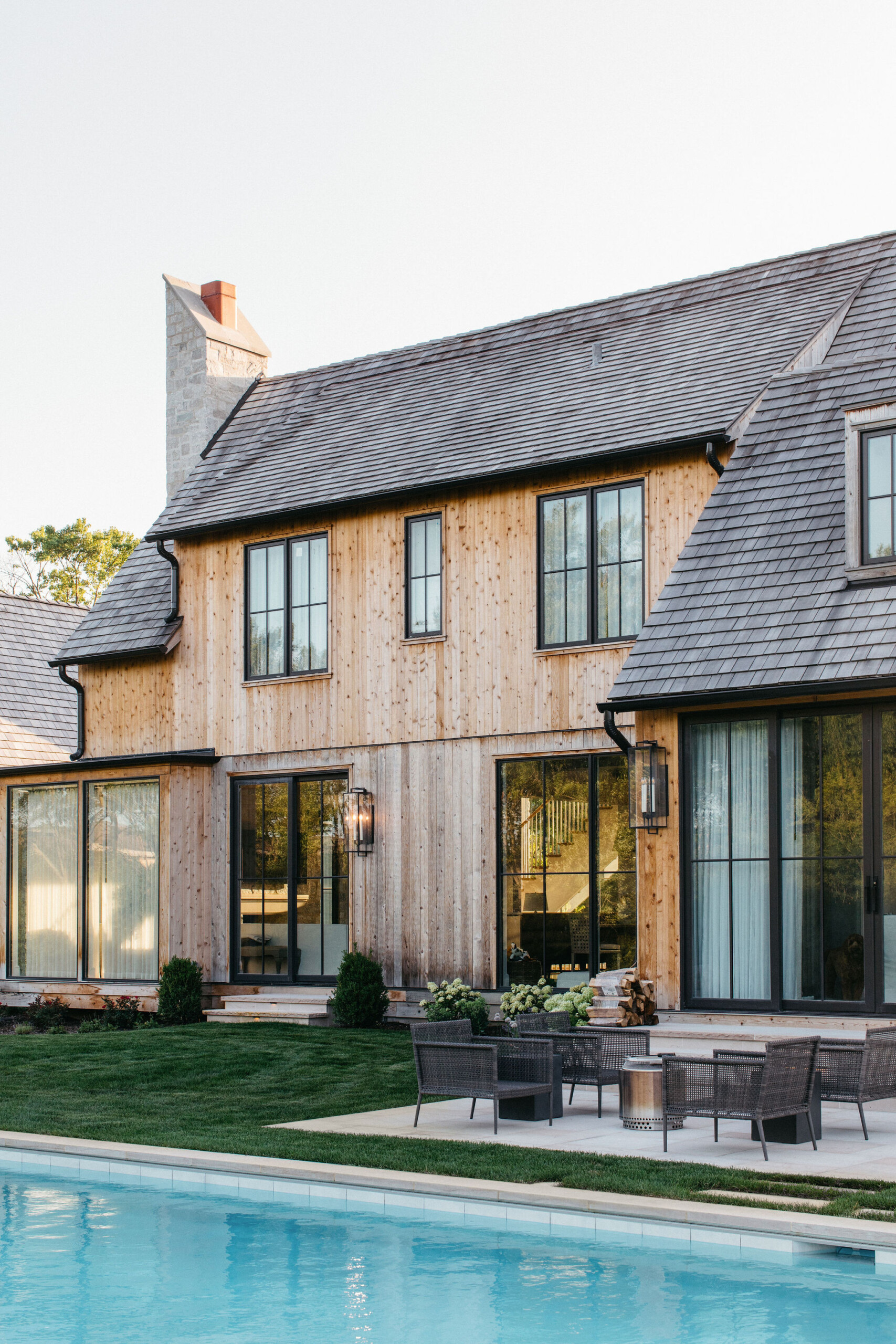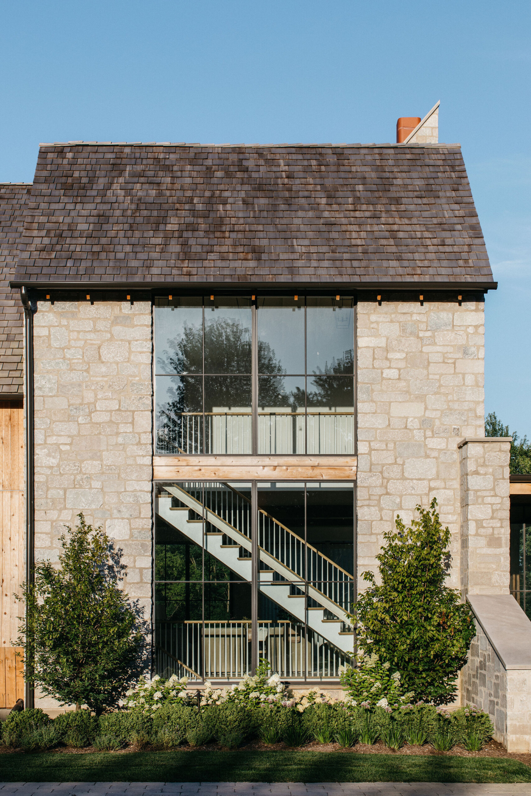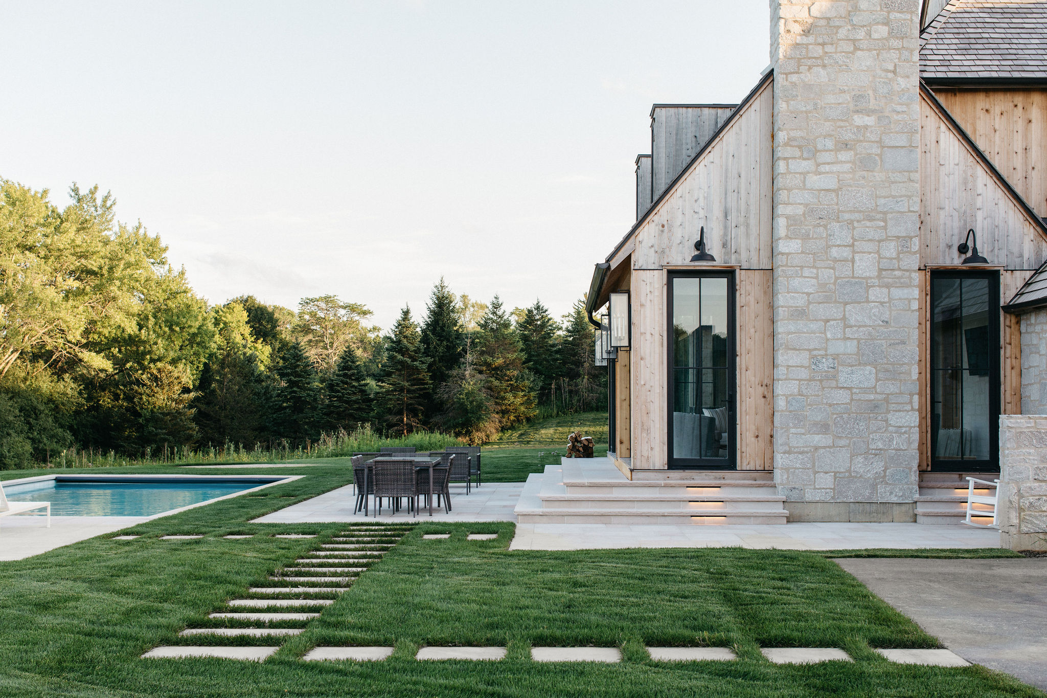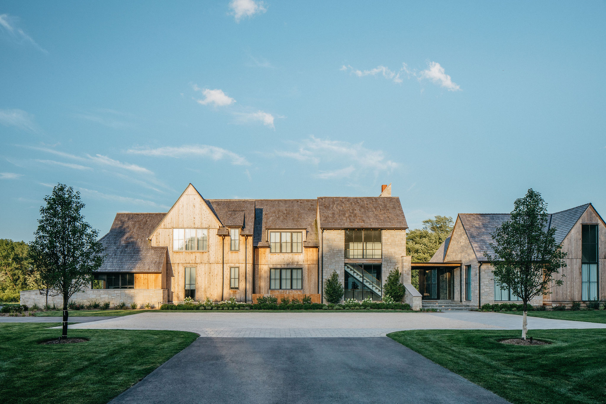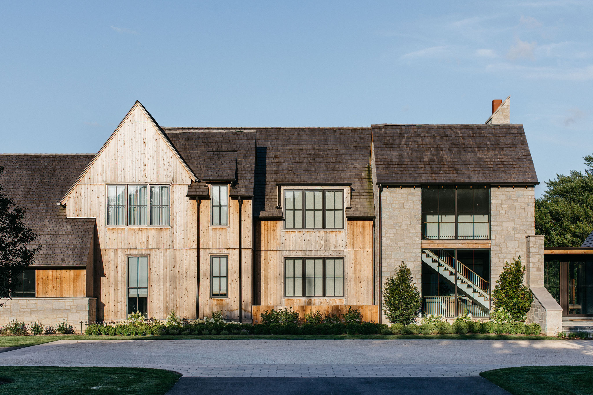 This elegant estate, beautifully enhanced by Milieu Landscaping, a trusted name across the North Shore and Northwest Suburbs, epitomizes modern outdoor luxury. The property features a striking swimming pool that serves as the backyard centerpiece, surrounded by an expansive, impeccably designed paver patio perfect for lounging and entertaining. Thoughtful landscape design integrates refined hardscaping with the home’s distinctive blend of natural stone and wood, creating a seamless transition from architecture to outdoor living. The lush, vibrant lawn areas are punctuated by unique stepping stone pathways, adding both visual interest and functional flow.