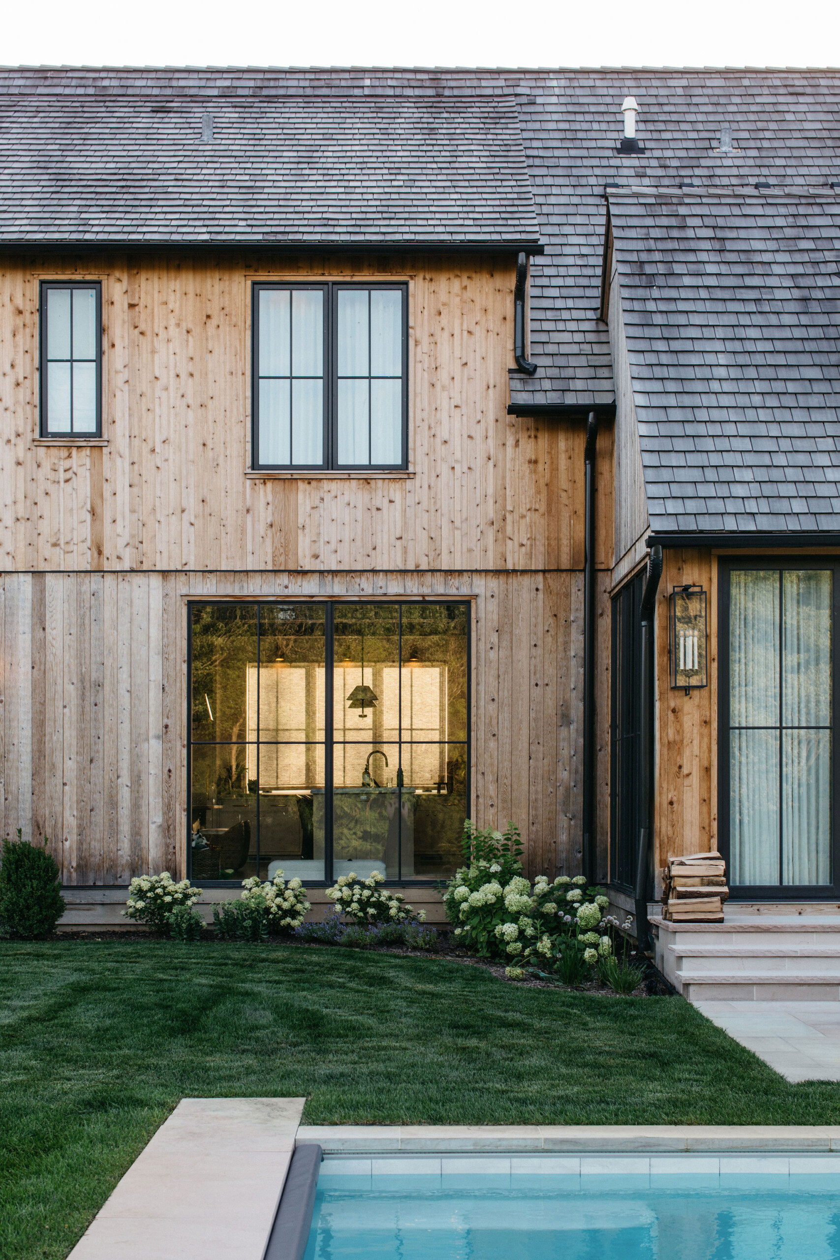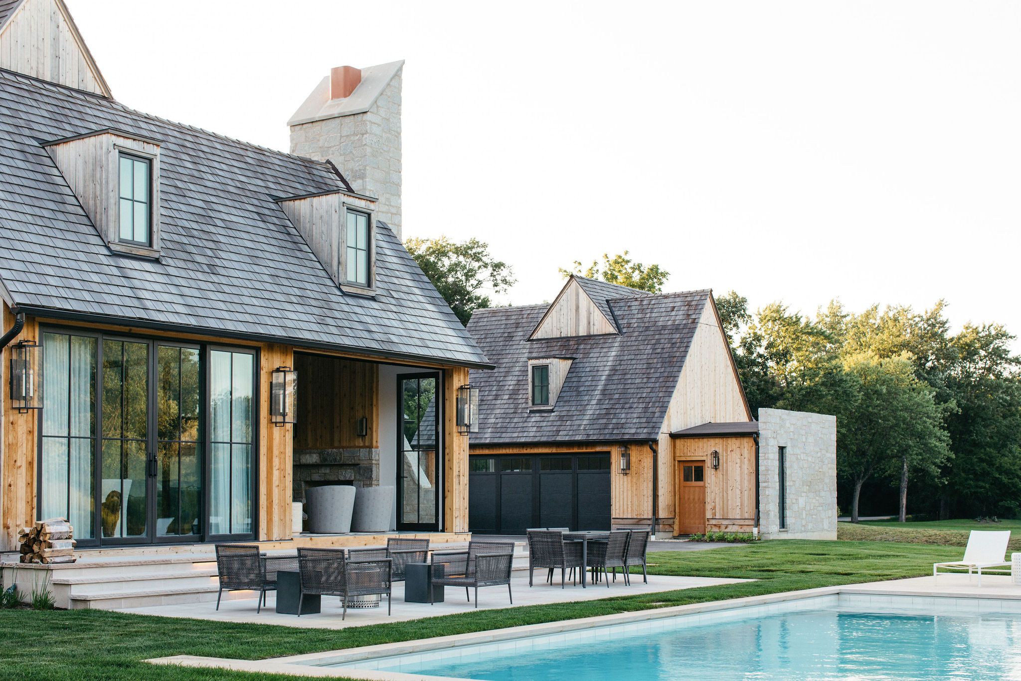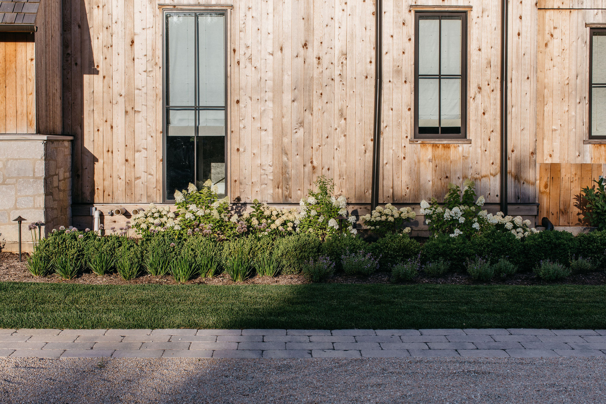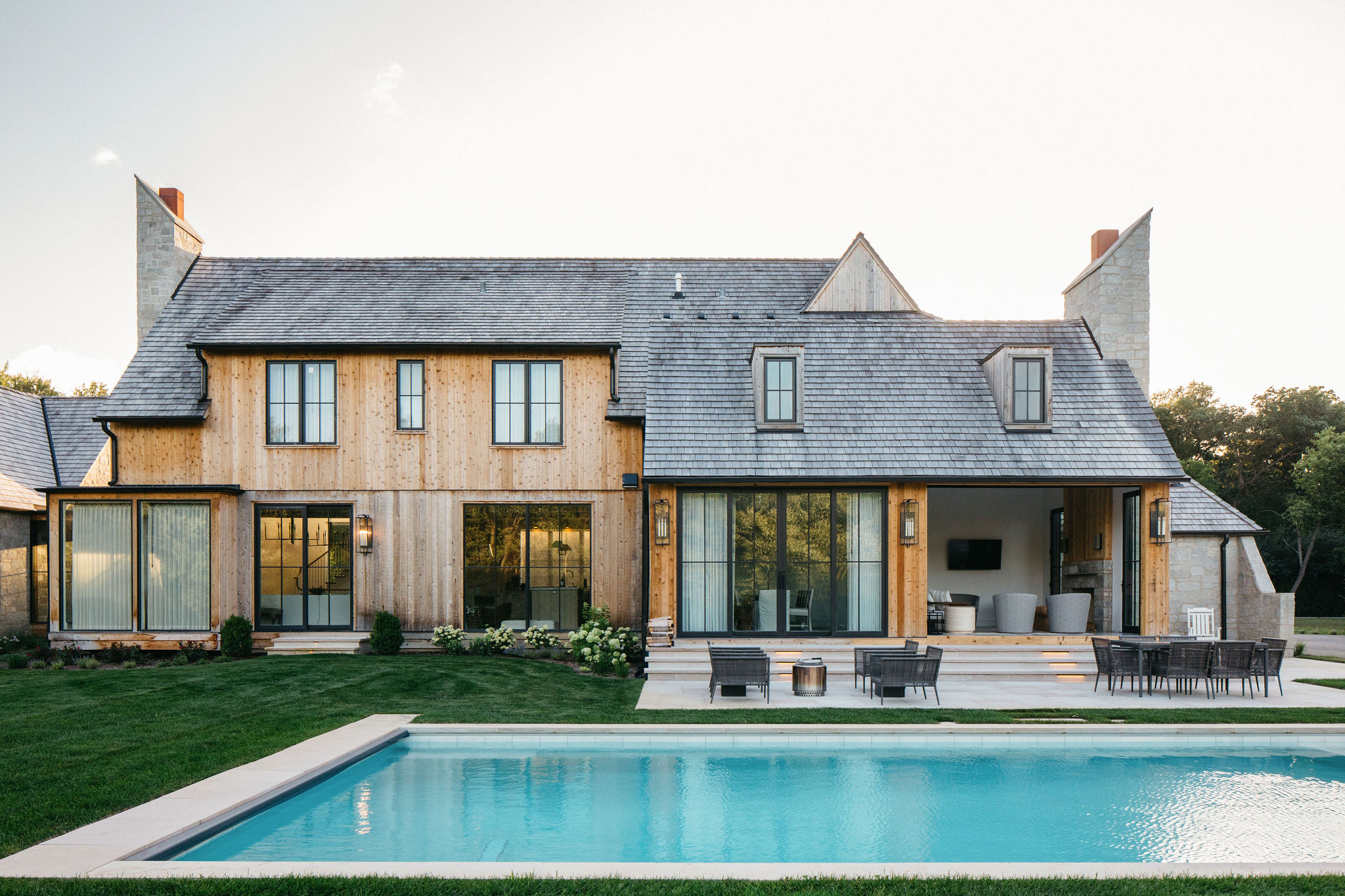 This elegant estate, beautifully enhanced by Milieu Landscaping, a trusted name across the North Shore and Northwest Suburbs, epitomizes modern outdoor luxury. The property features a striking swimming pool that serves as the backyard centerpiece, surrounded by an expansive, impeccably designed paver patio perfect for lounging and entertaining. Thoughtful landscape design integrates refined hardscaping with the home’s distinctive blend of natural stone and wood, creating a seamless transition from architecture to outdoor living. The lush, vibrant lawn areas are punctuated by unique stepping stone pathways, adding both visual interest and functional flow.