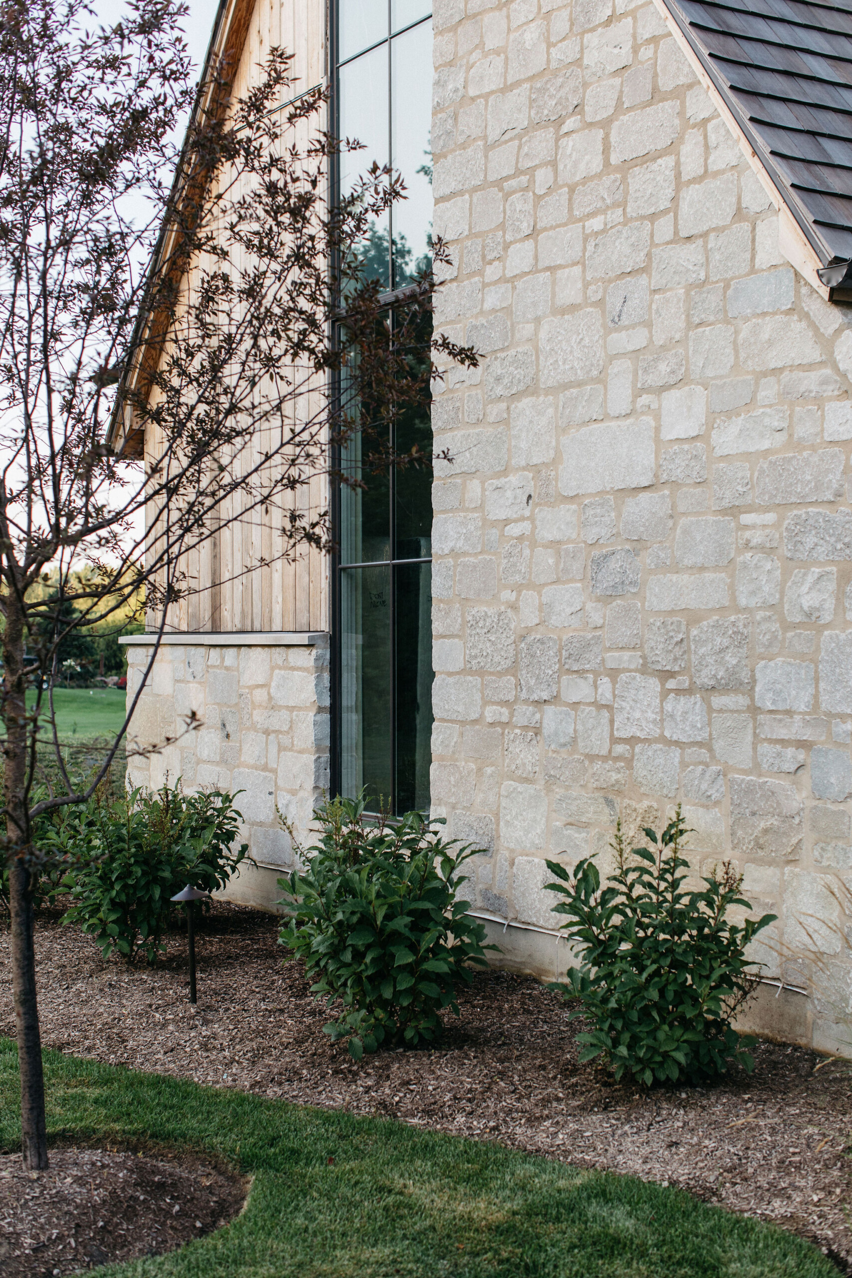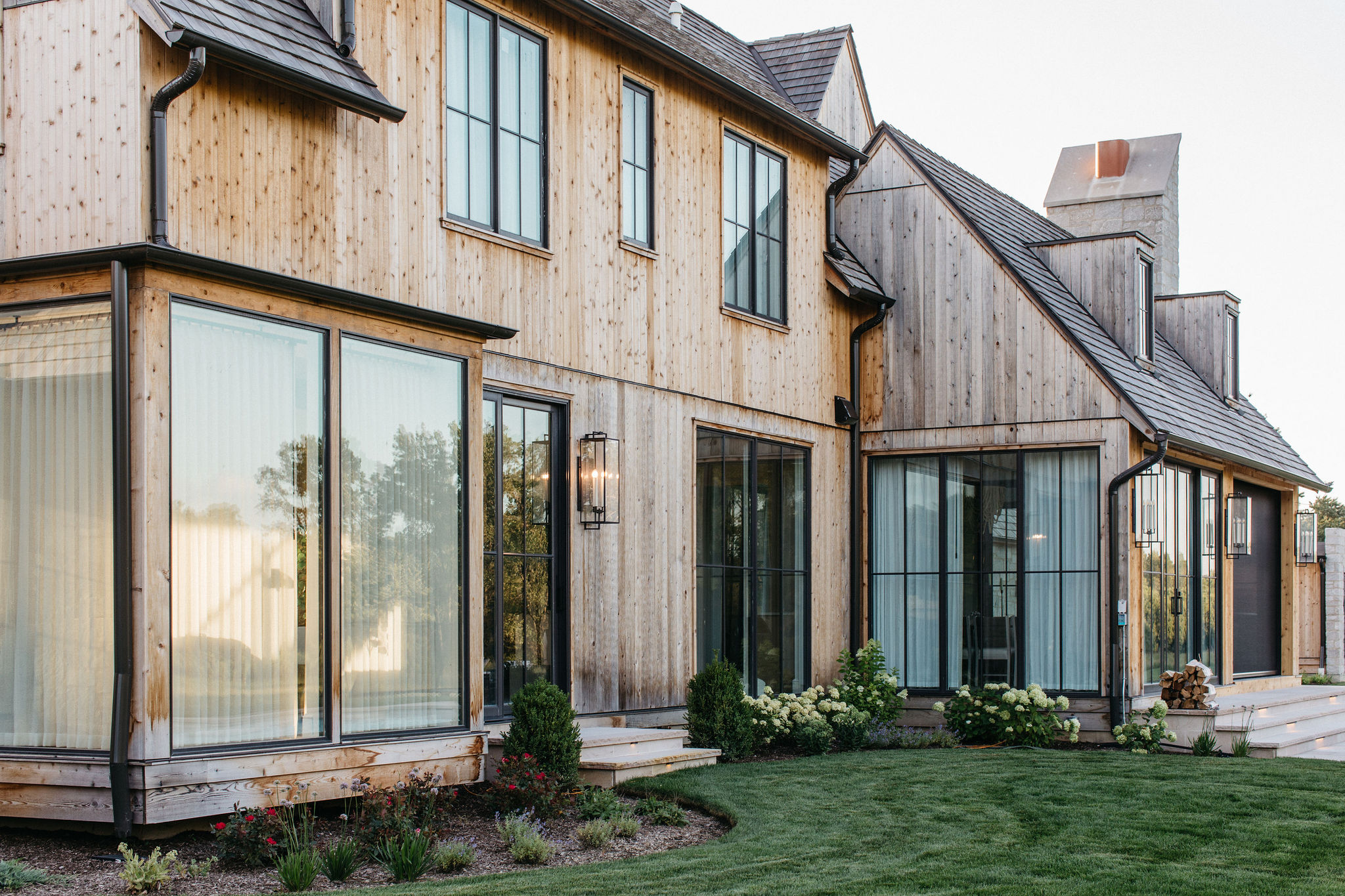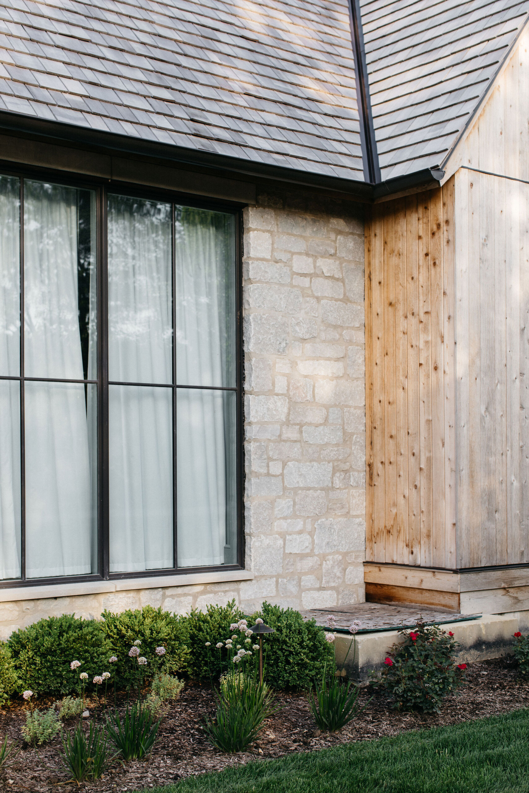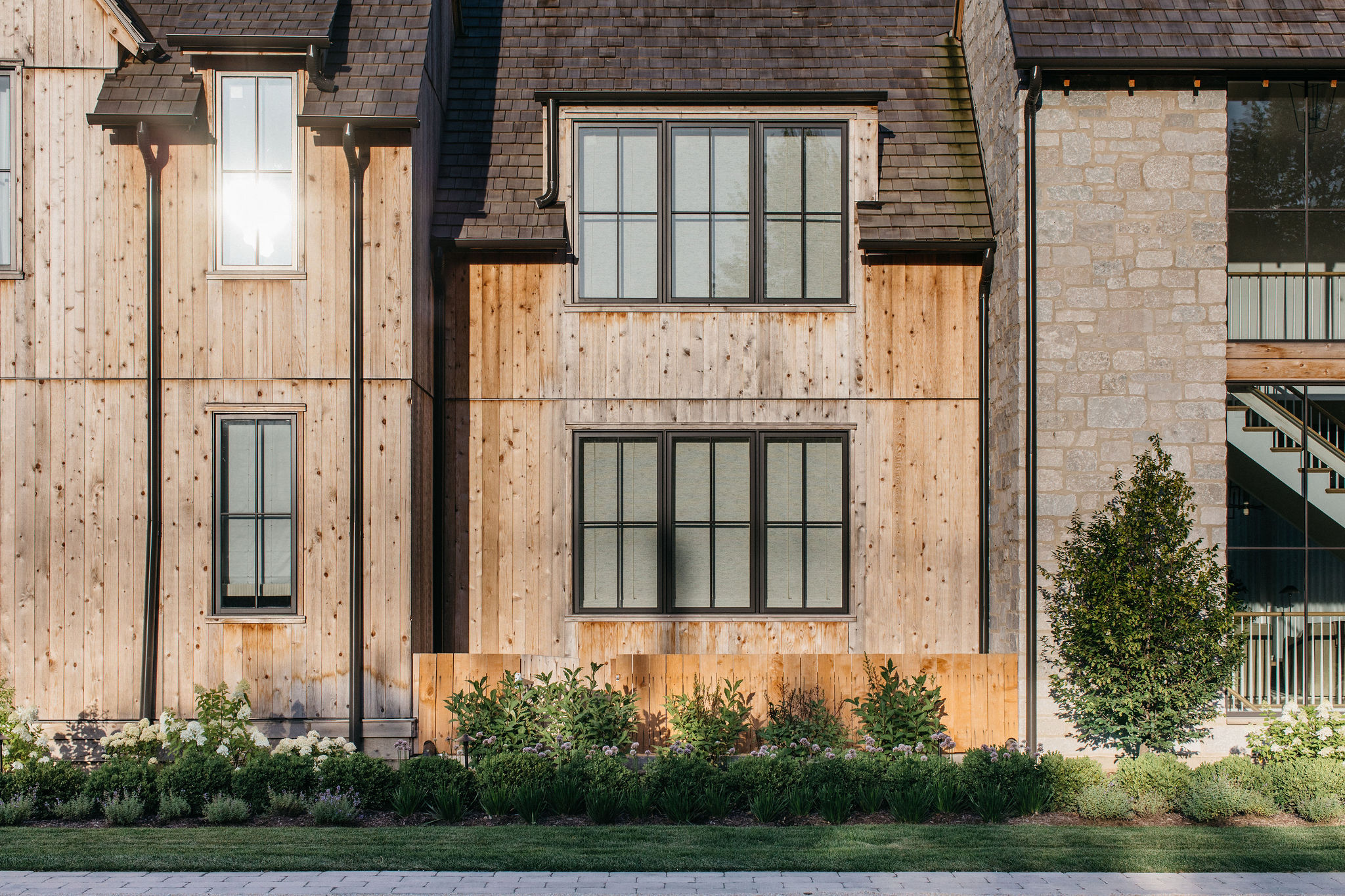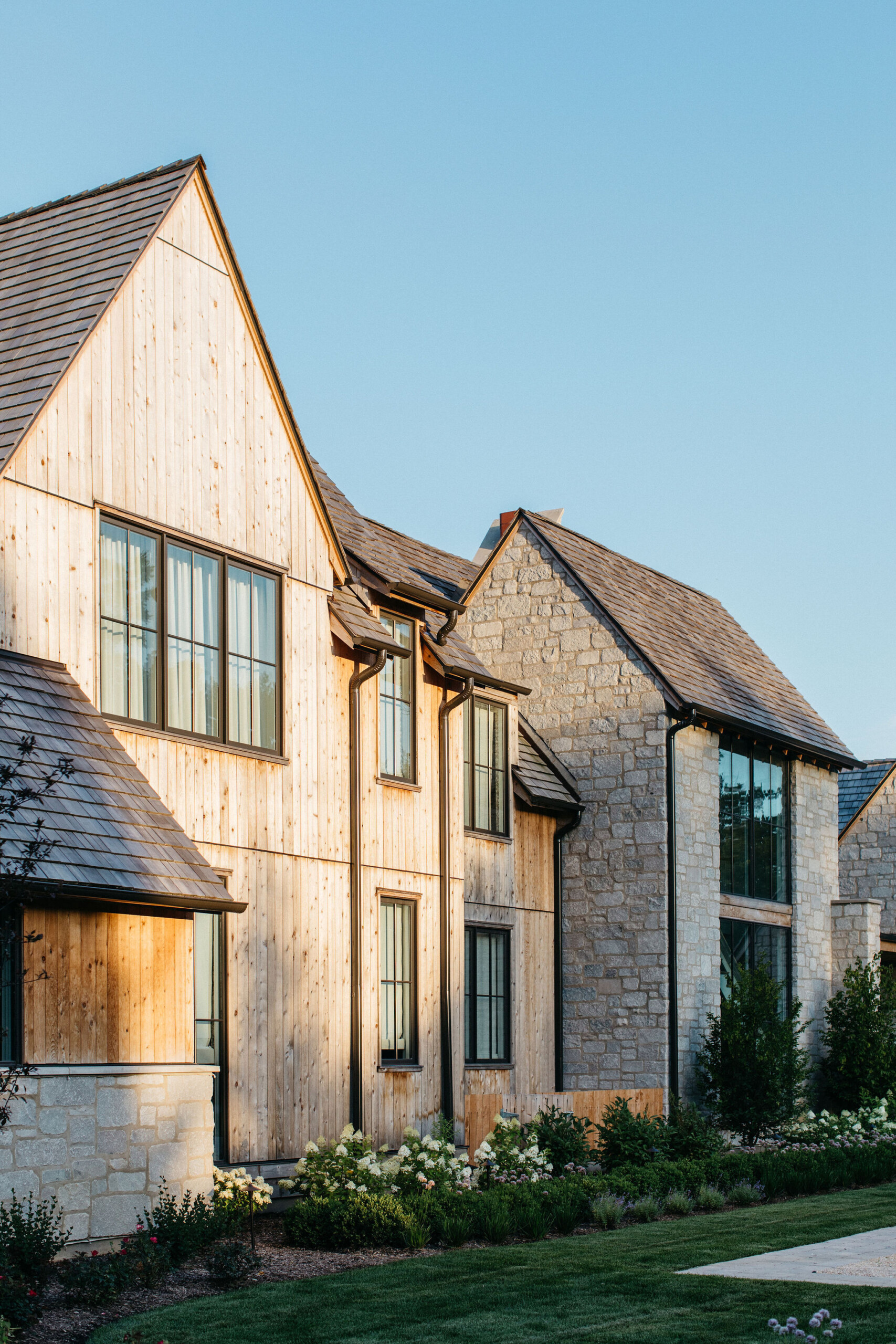 This elegant estate, beautifully enhanced by Milieu Landscaping, a trusted name across the North Shore and Northwest Suburbs, epitomizes modern outdoor luxury. The property features a striking swimming pool that serves as the backyard centerpiece, surrounded by an expansive, impeccably designed paver patio perfect for lounging and entertaining. Thoughtful landscape design integrates refined hardscaping with the home’s distinctive blend of natural stone and wood, creating a seamless transition from architecture to outdoor living. The lush, vibrant lawn areas are punctuated by unique stepping stone pathways, adding both visual interest and functional flow.