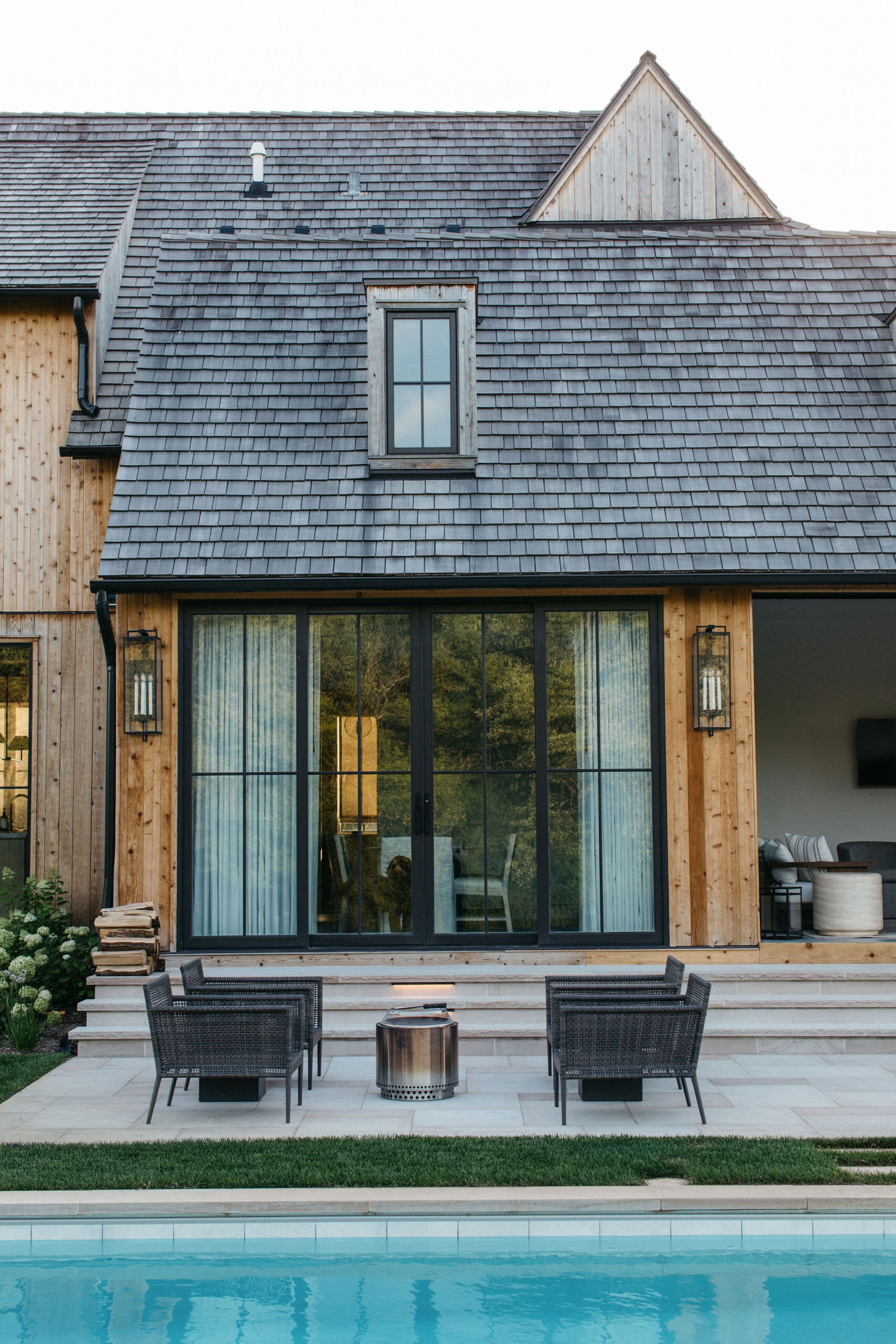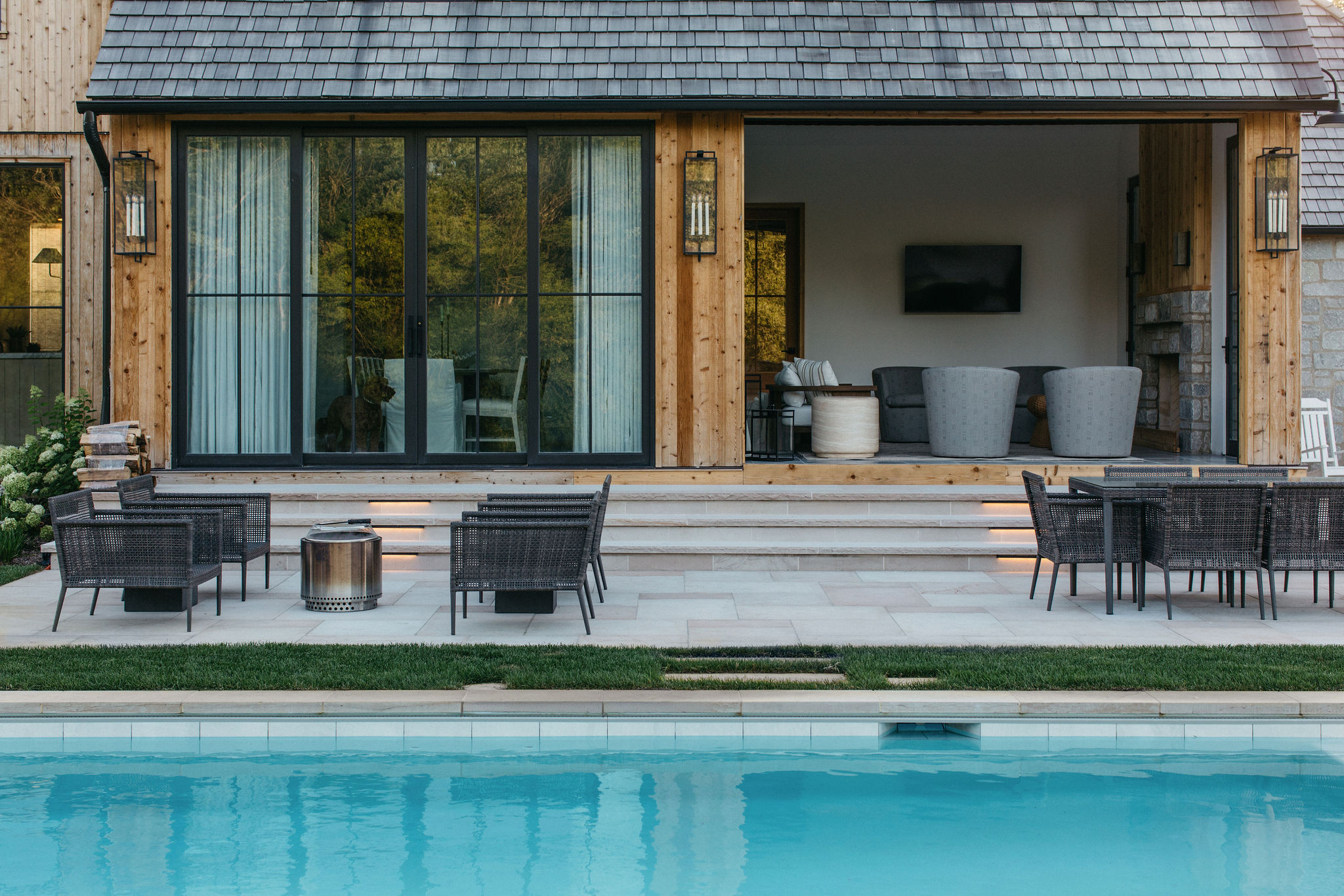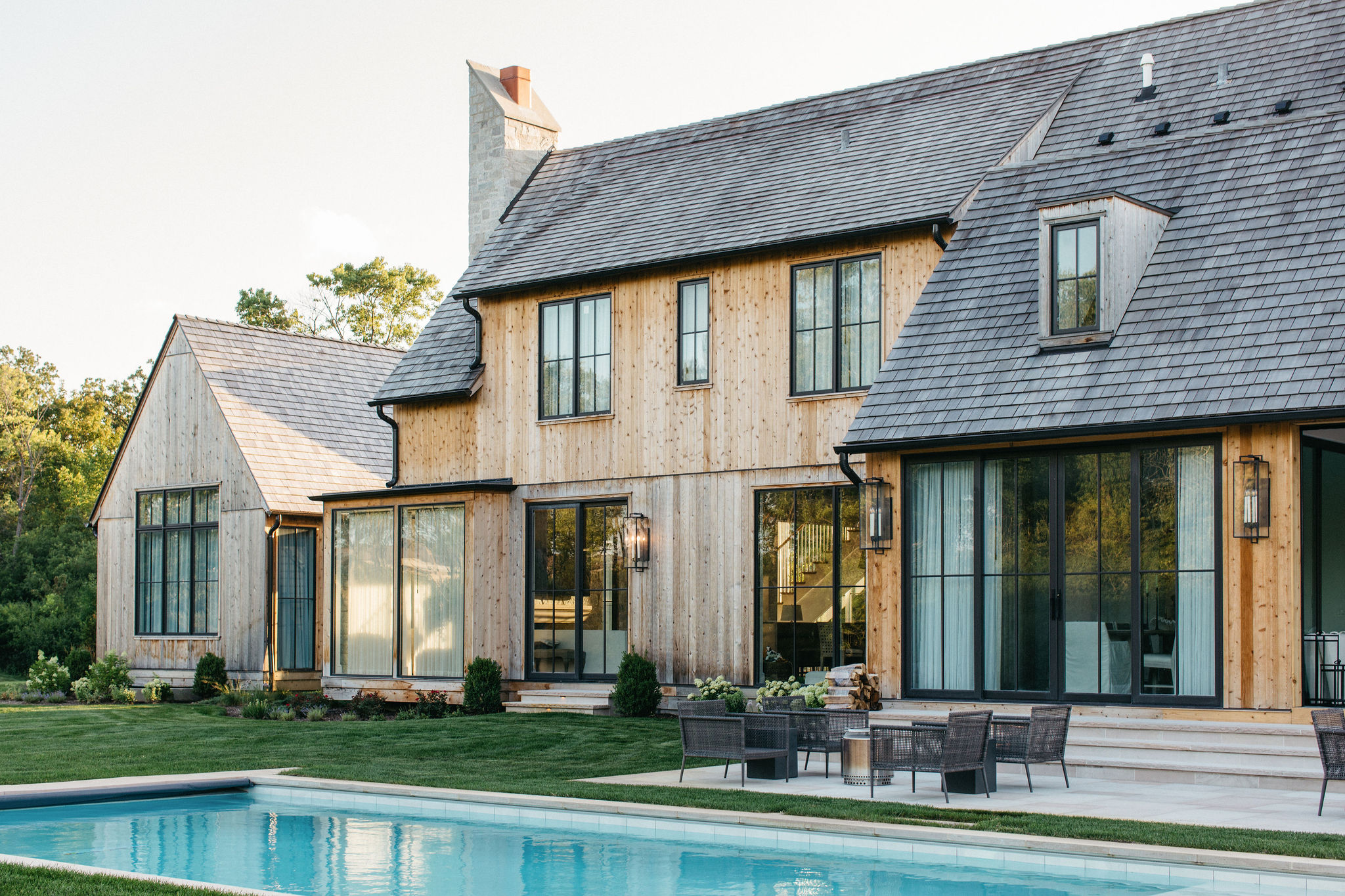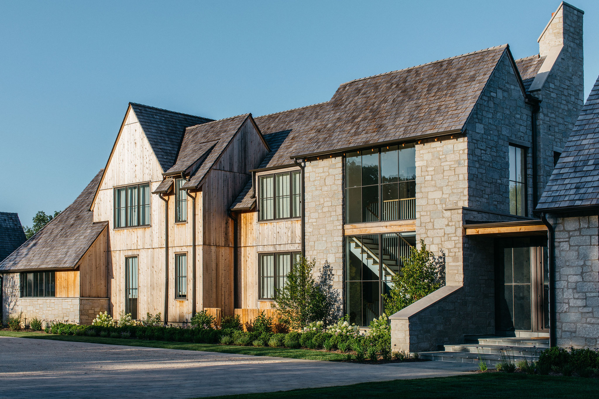 This elegant estate, beautifully enhanced by Milieu Landscaping, a trusted name across the North Shore and Northwest Suburbs, epitomizes modern outdoor luxury. The property features a striking swimming pool that serves as the backyard centerpiece, surrounded by an expansive, impeccably designed paver patio perfect for lounging and entertaining. Thoughtful landscape design integrates refined hardscaping with the home’s distinctive blend of natural stone and wood, creating a seamless transition from architecture to outdoor living. The lush, vibrant lawn areas are punctuated by unique stepping stone pathways, adding both visual interest and functional flow.