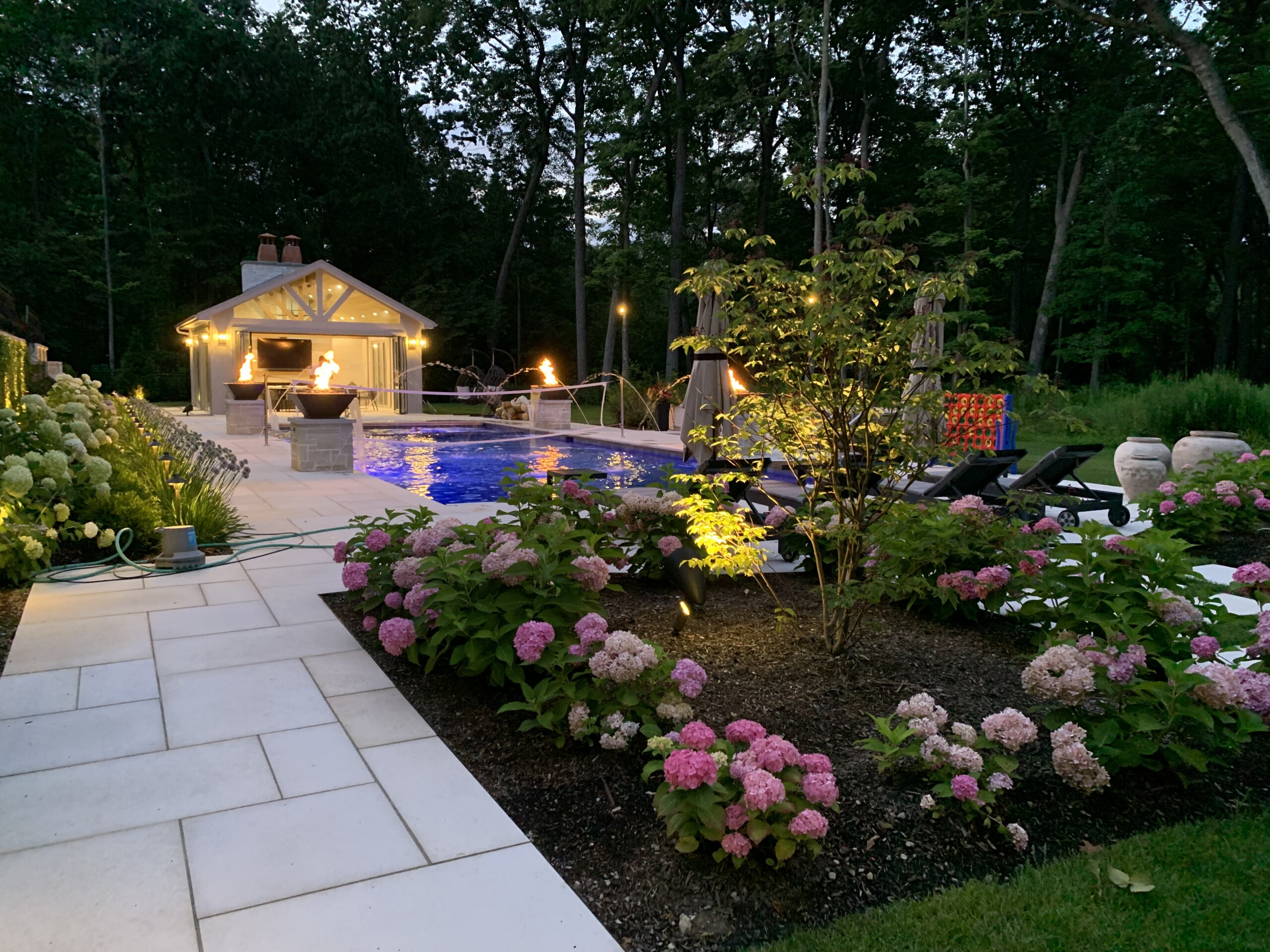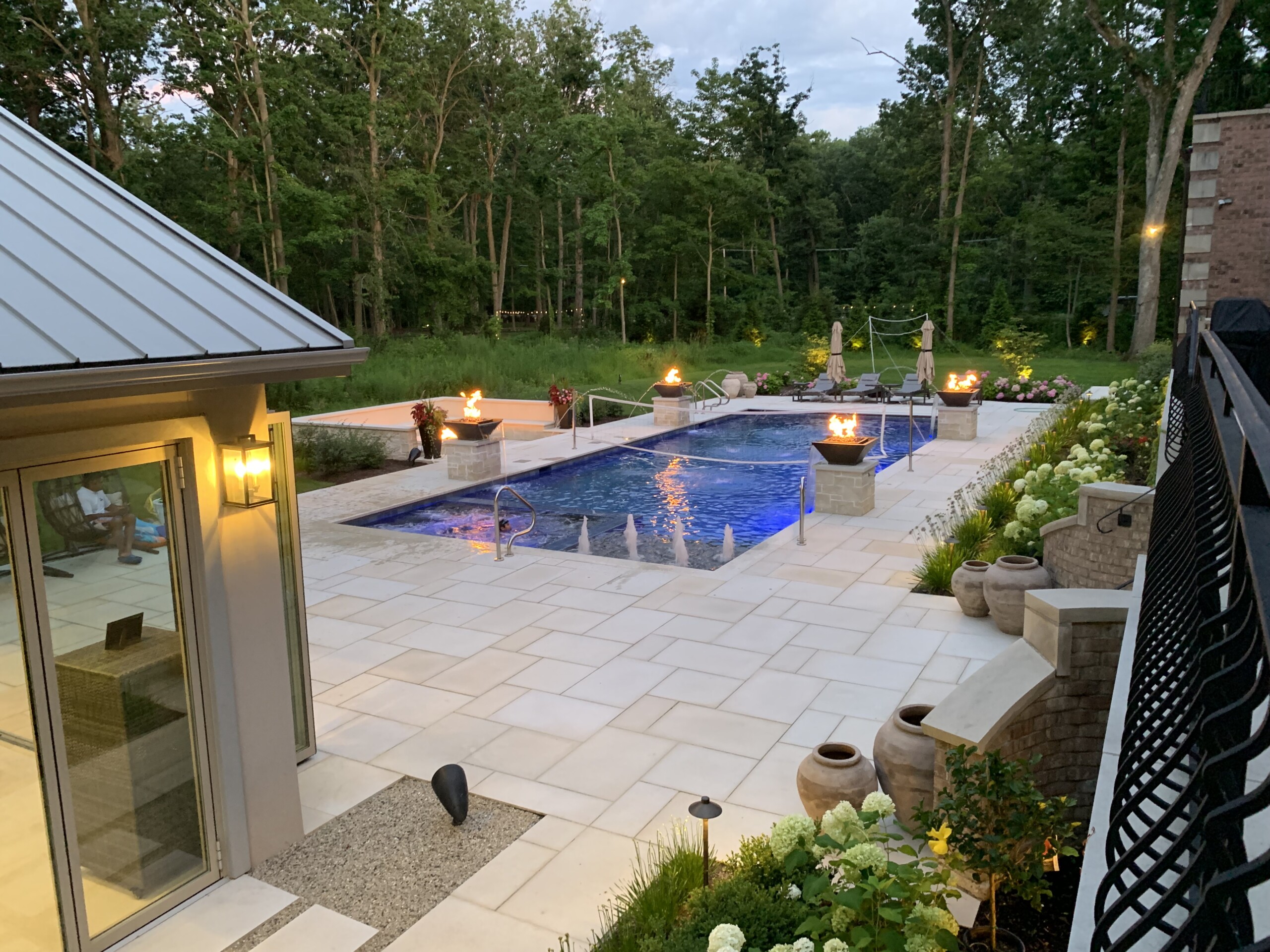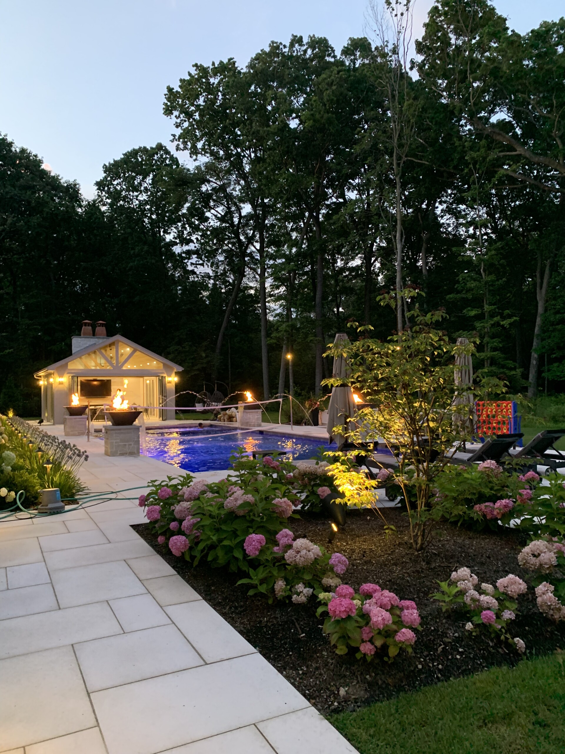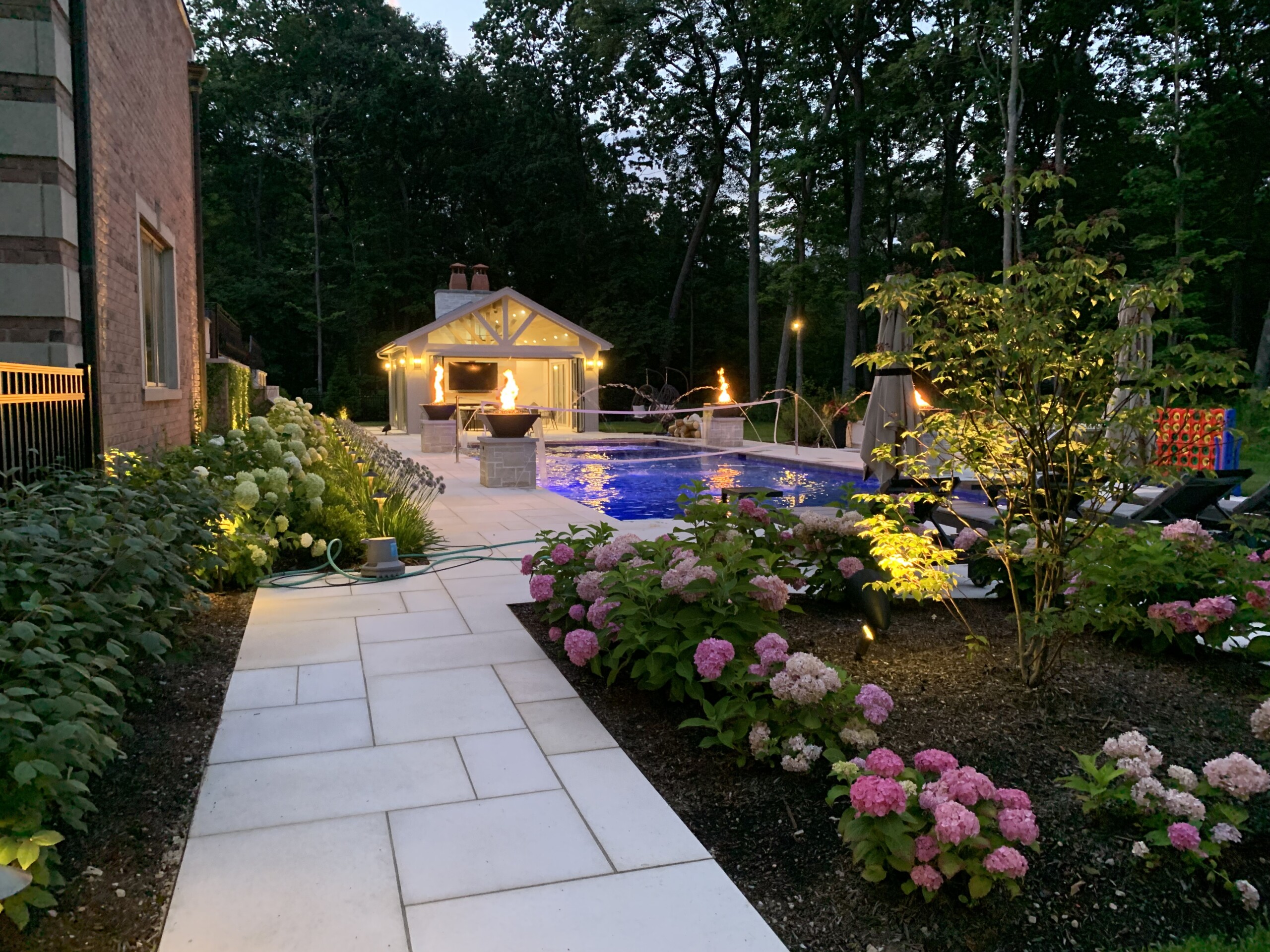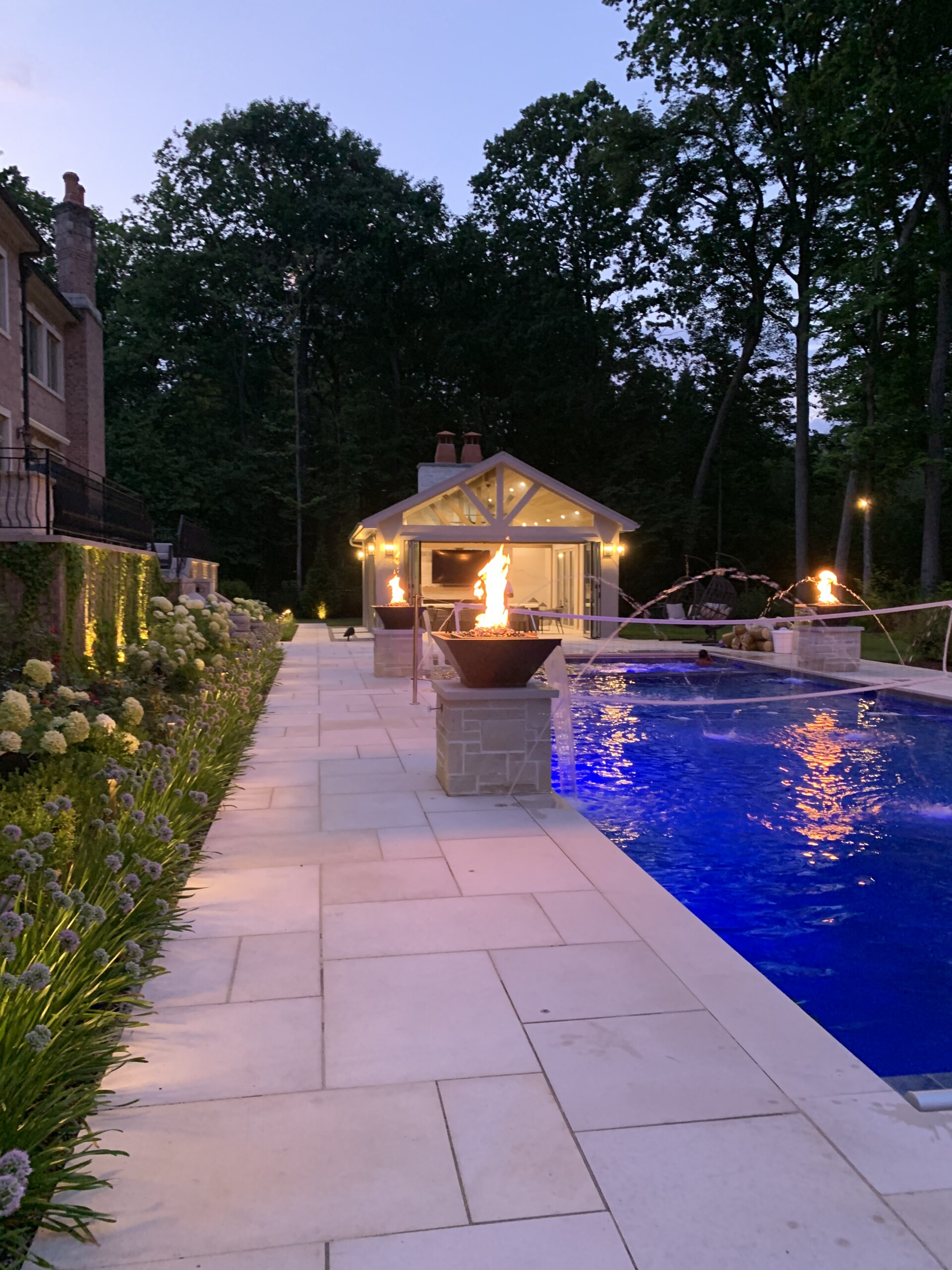 Precision was paramount in this build, featuring expert hardscaping that connects the main residence to the pool house. Our masons utilized Valders Dove White Sandblast flooring and Splitface stone for the fireplaces and the custom outdoor kitchen to ensure a timeless aesthetic. The wide-format pavers and tiered stone steps provide a grand sense of scale that complements the home’s architecture. These premium hardscaping elements provide the structural elegance required for a high-end, cohesive outdoor living environment.