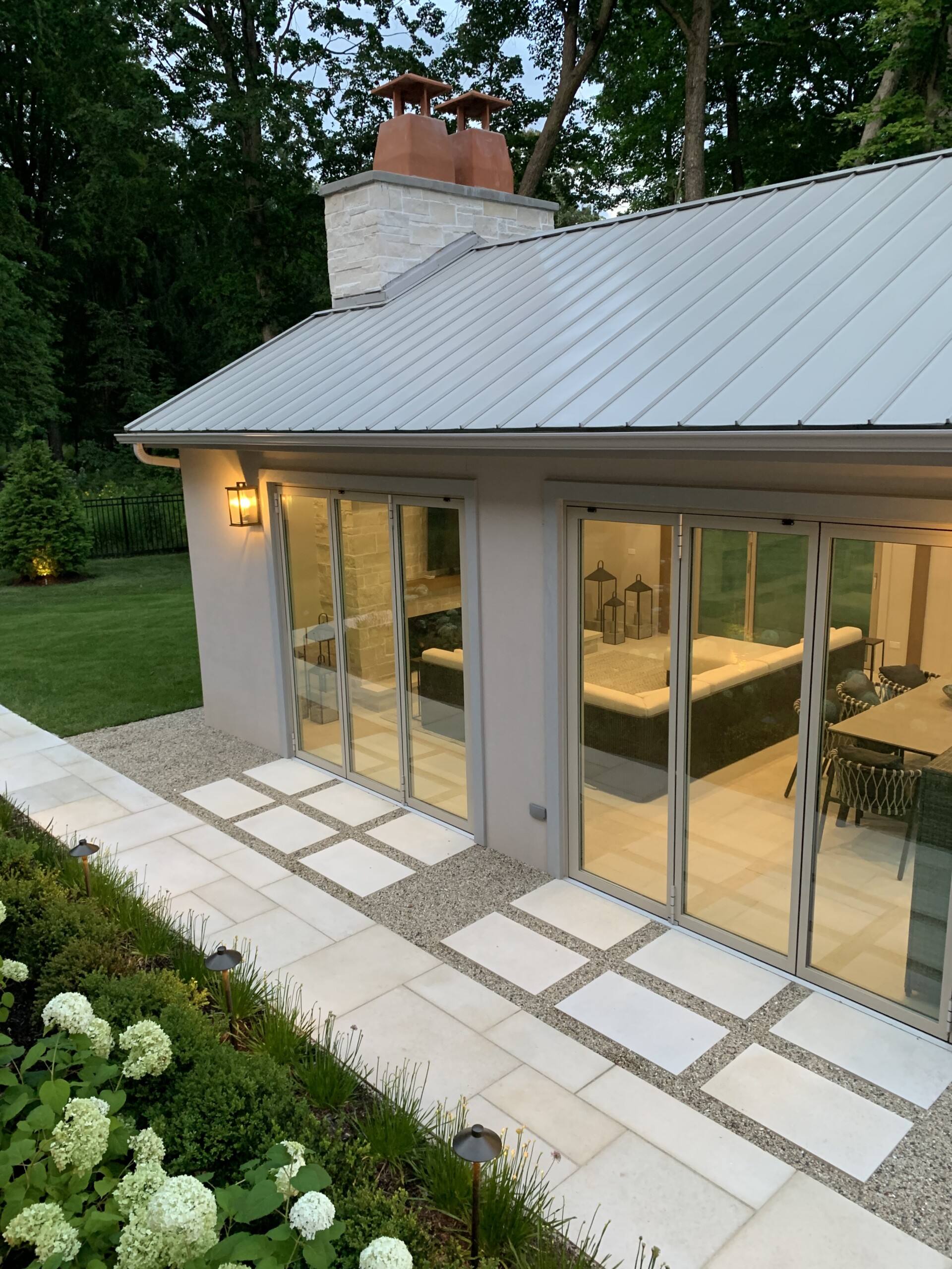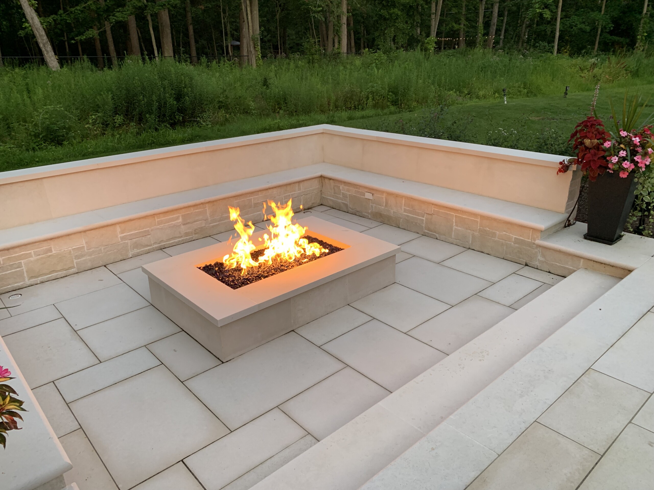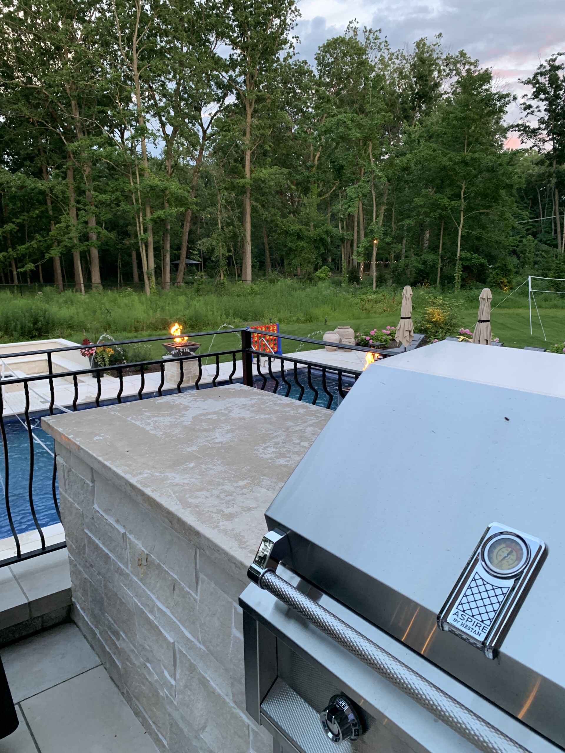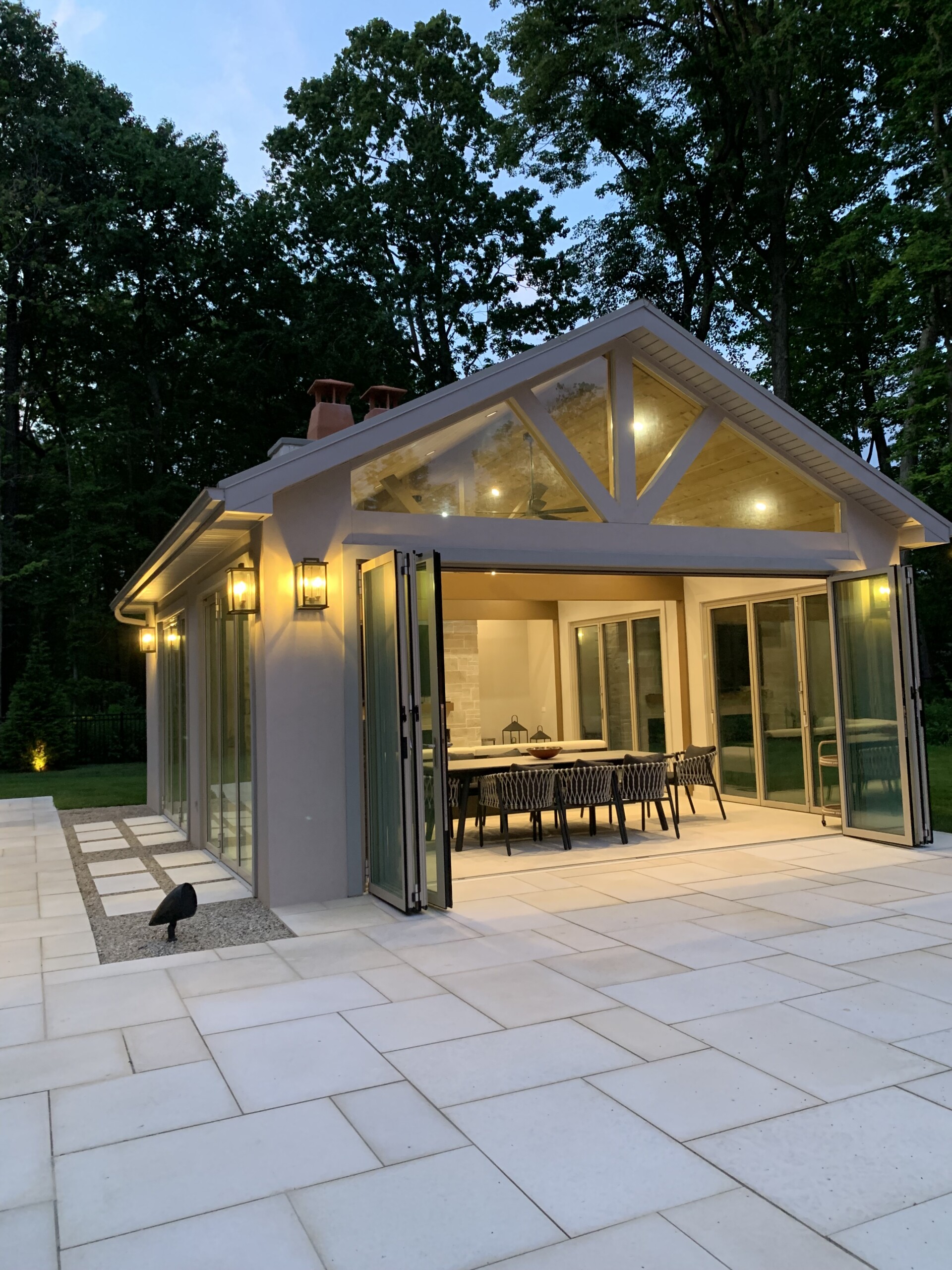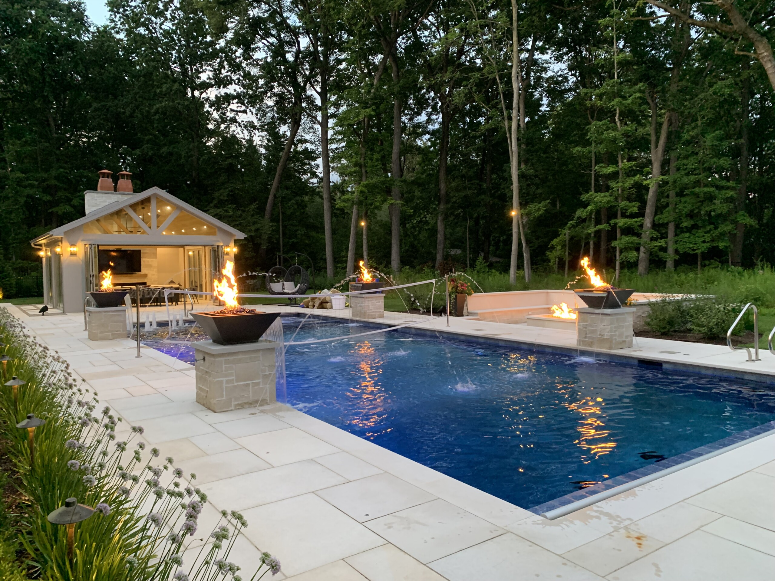 Precision was paramount in this build, featuring expert hardscaping that connects the main residence to the pool house. Our masons utilized Valders Dove White Sandblast flooring and Splitface stone for the fireplaces and the custom outdoor kitchen to ensure a timeless aesthetic. The wide-format pavers and tiered stone steps provide a grand sense of scale that complements the home’s architecture. These premium hardscaping elements provide the structural elegance required for a high-end, cohesive outdoor living environment.