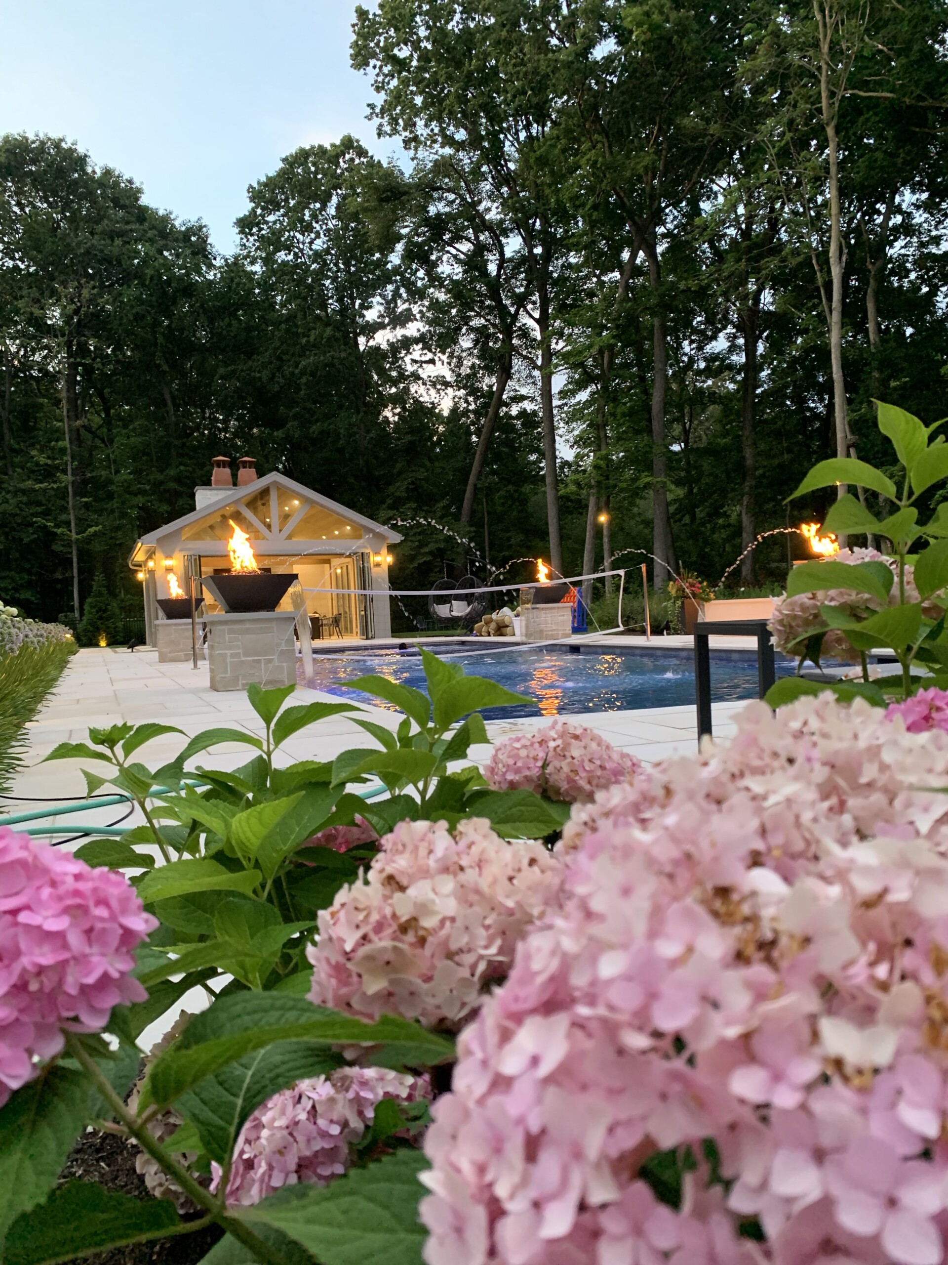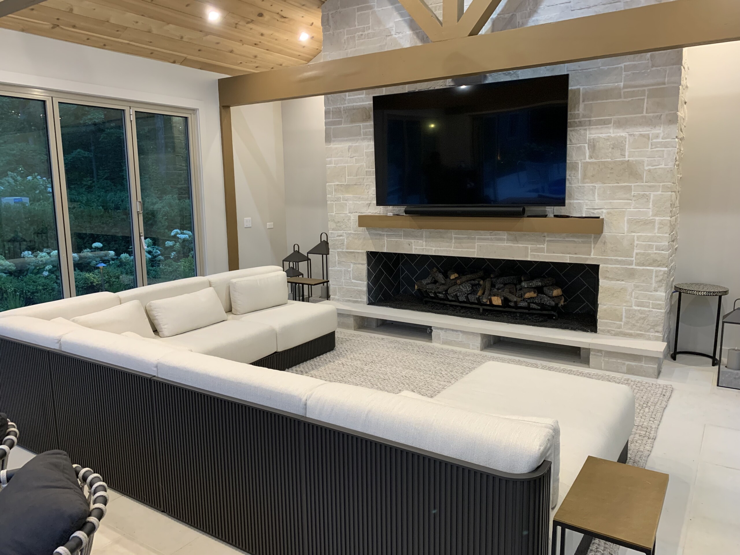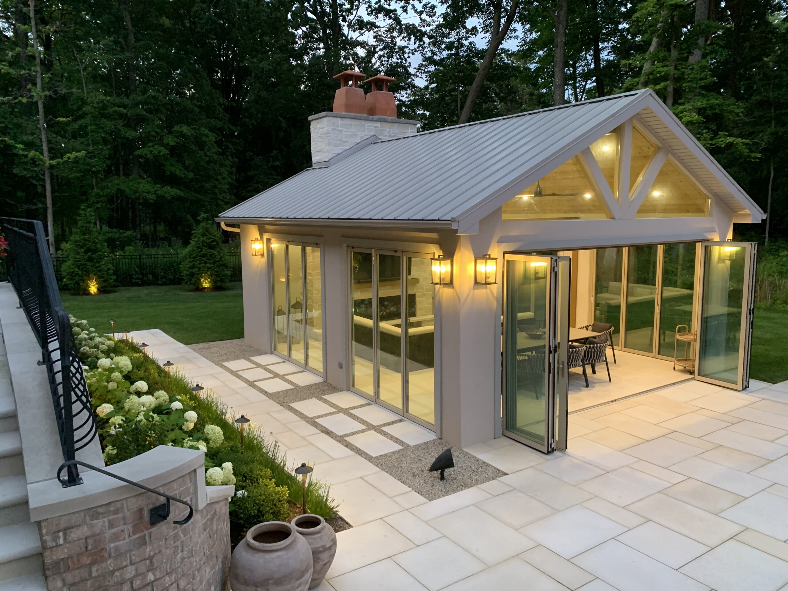 This stunning all-seasons space serves as the crown jewel of our backyard design. With a neutral palette and soaring timber beams, the space is perfect for game days or quiet mornings by the fire. The folding glass wall system allows the indoors to merge seamlessly with the pool deck on warm summer afternoons. It showcases how professional landscape services extend beyond plants, incorporating structural luxury that allows for comfortable outdoor living regardless of the season.