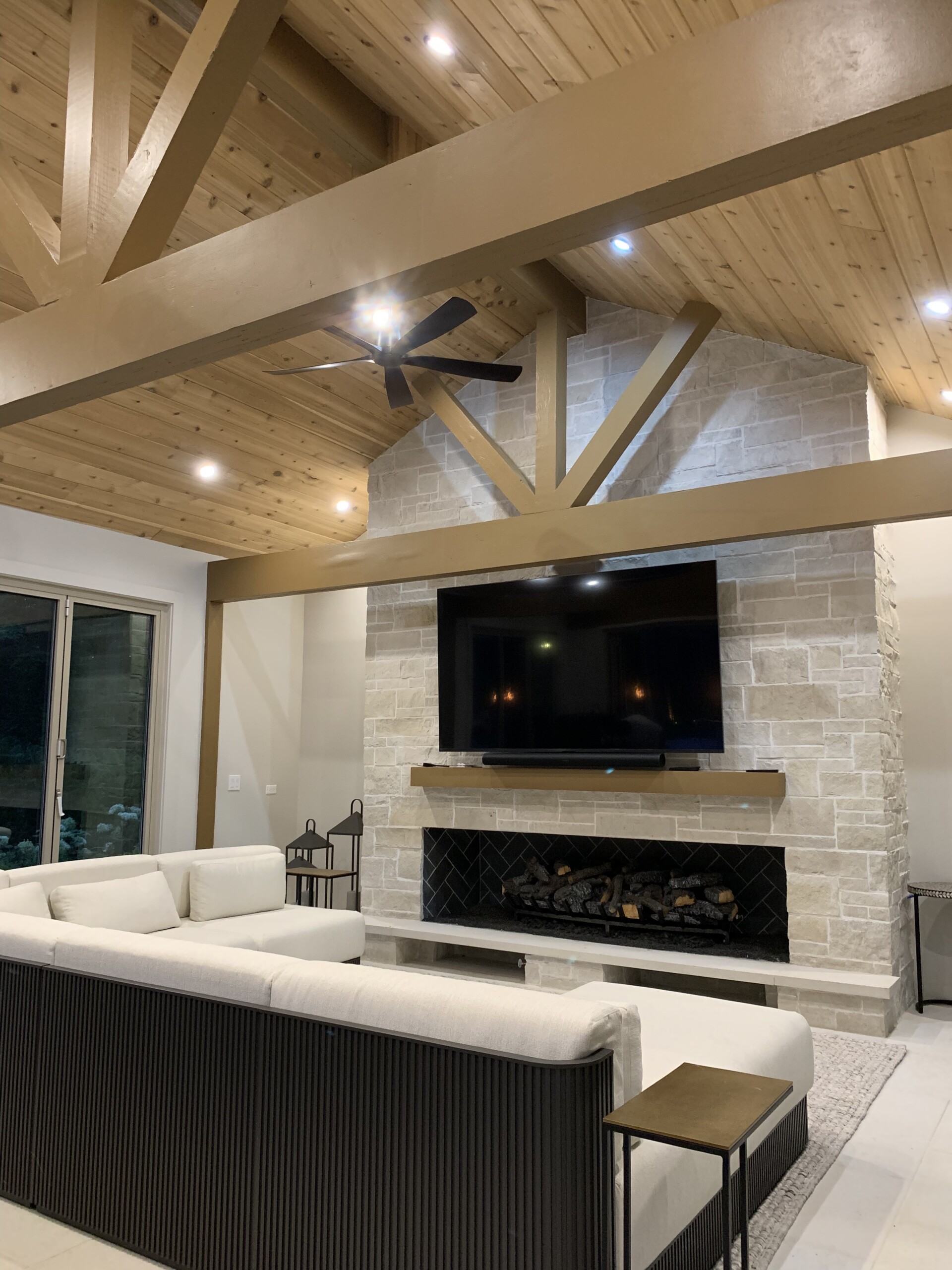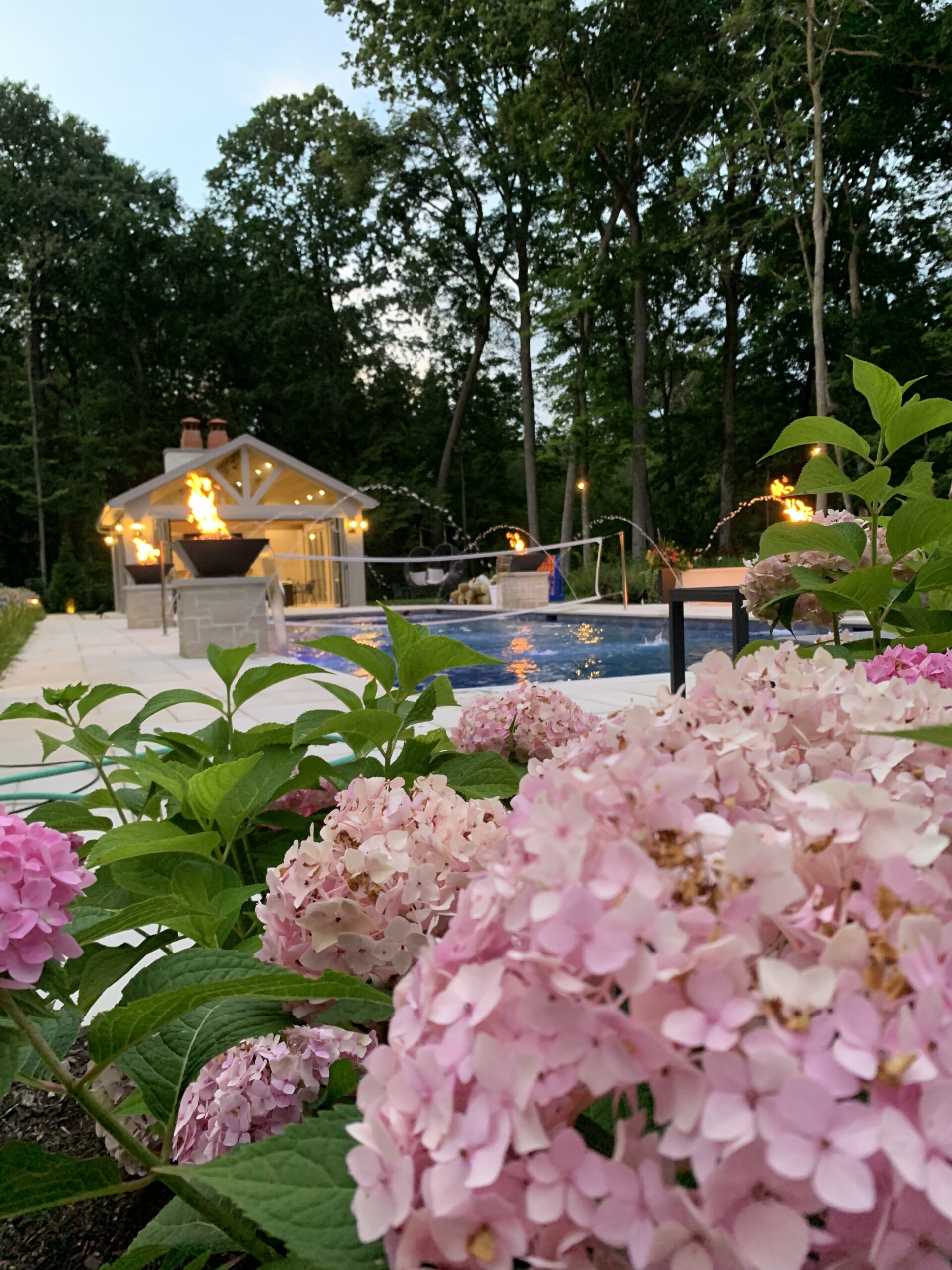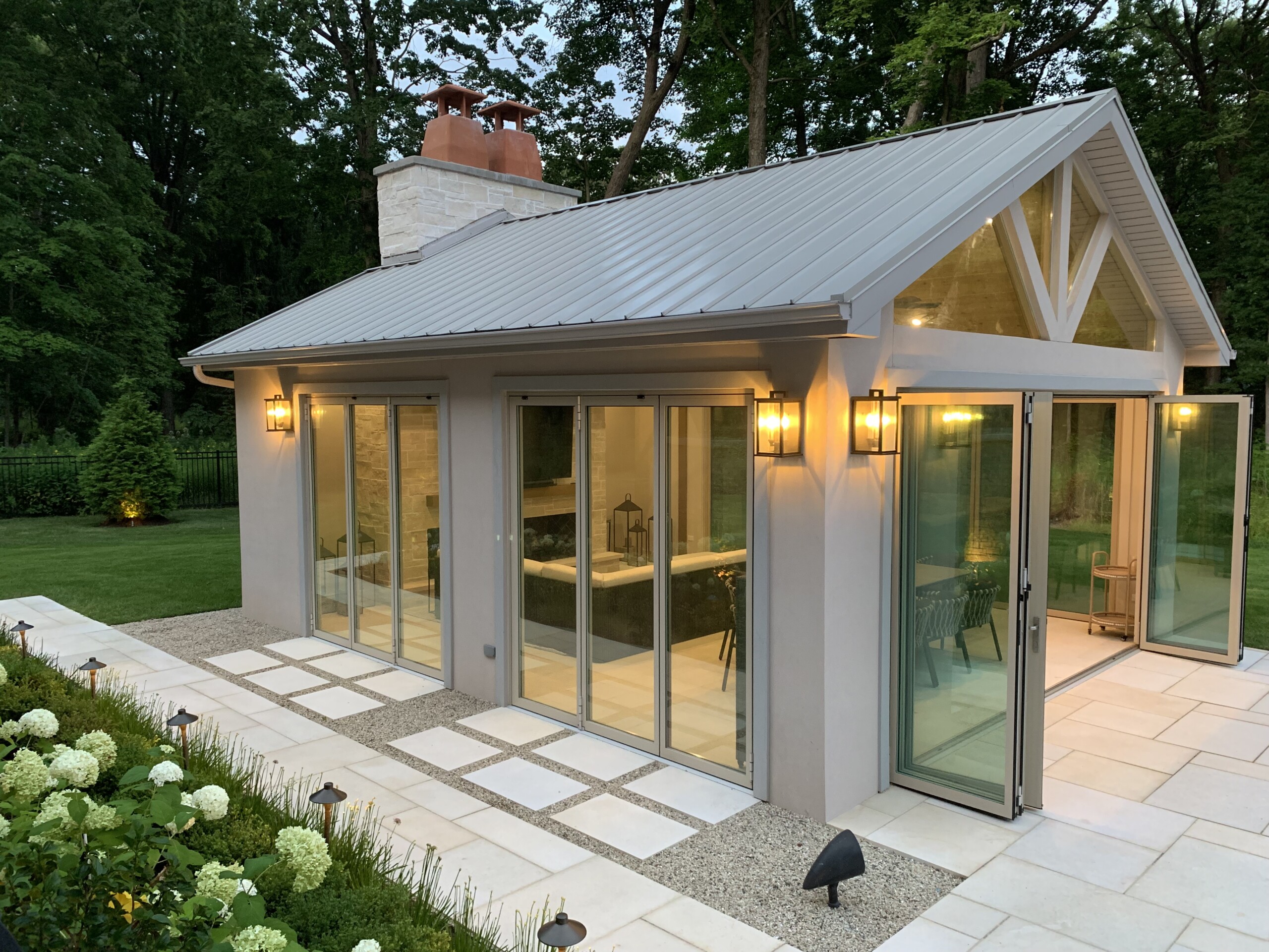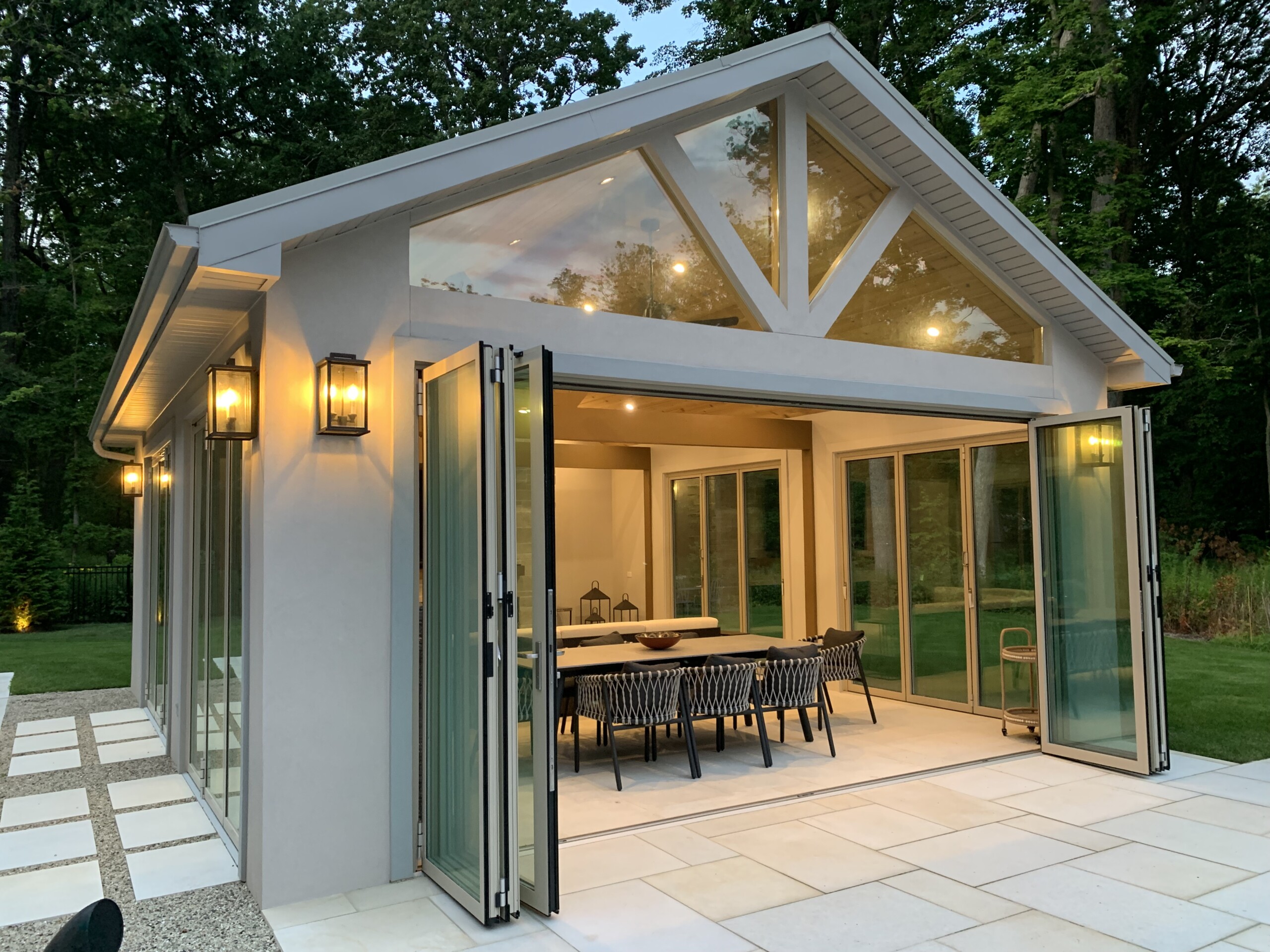 This stunning all-seasons space serves as the crown jewel of our backyard design. With a neutral palette and soaring timber beams, the space is perfect for game days or quiet mornings by the fire. The folding glass wall system allows the indoors to merge seamlessly with the pool deck on warm summer afternoons. It showcases how professional landscape services extend beyond plants, incorporating structural luxury that allows for comfortable outdoor living regardless of the season.