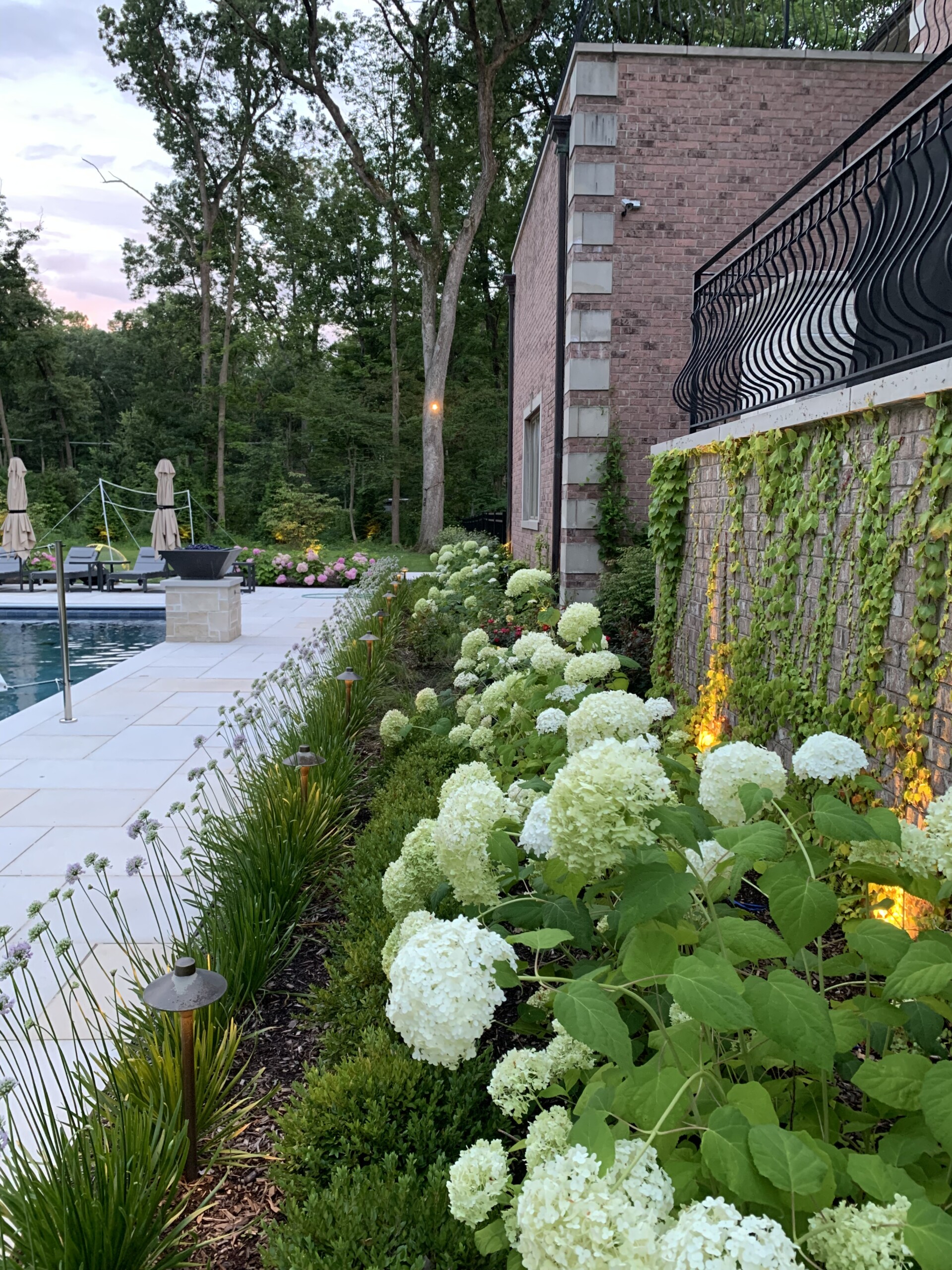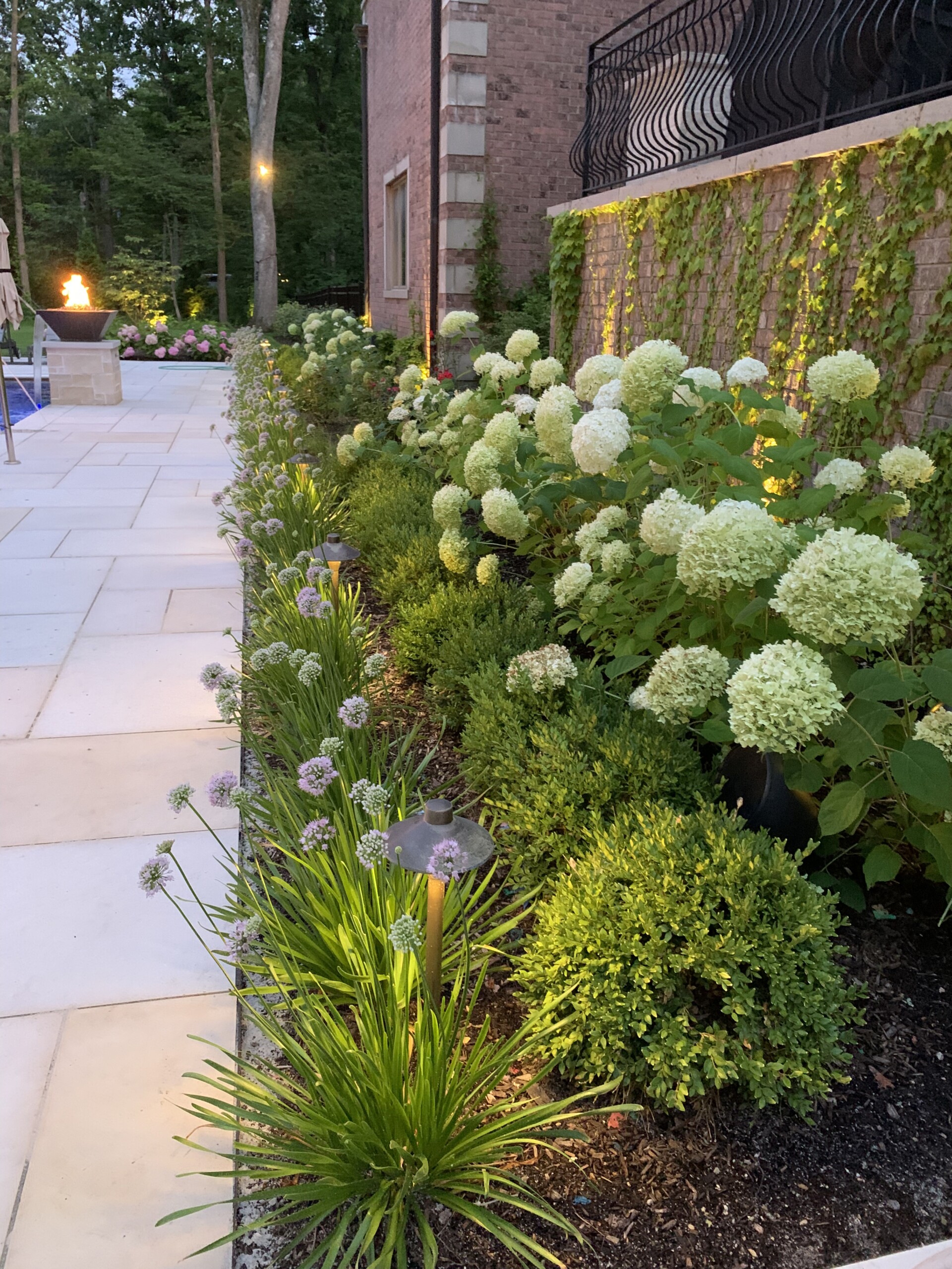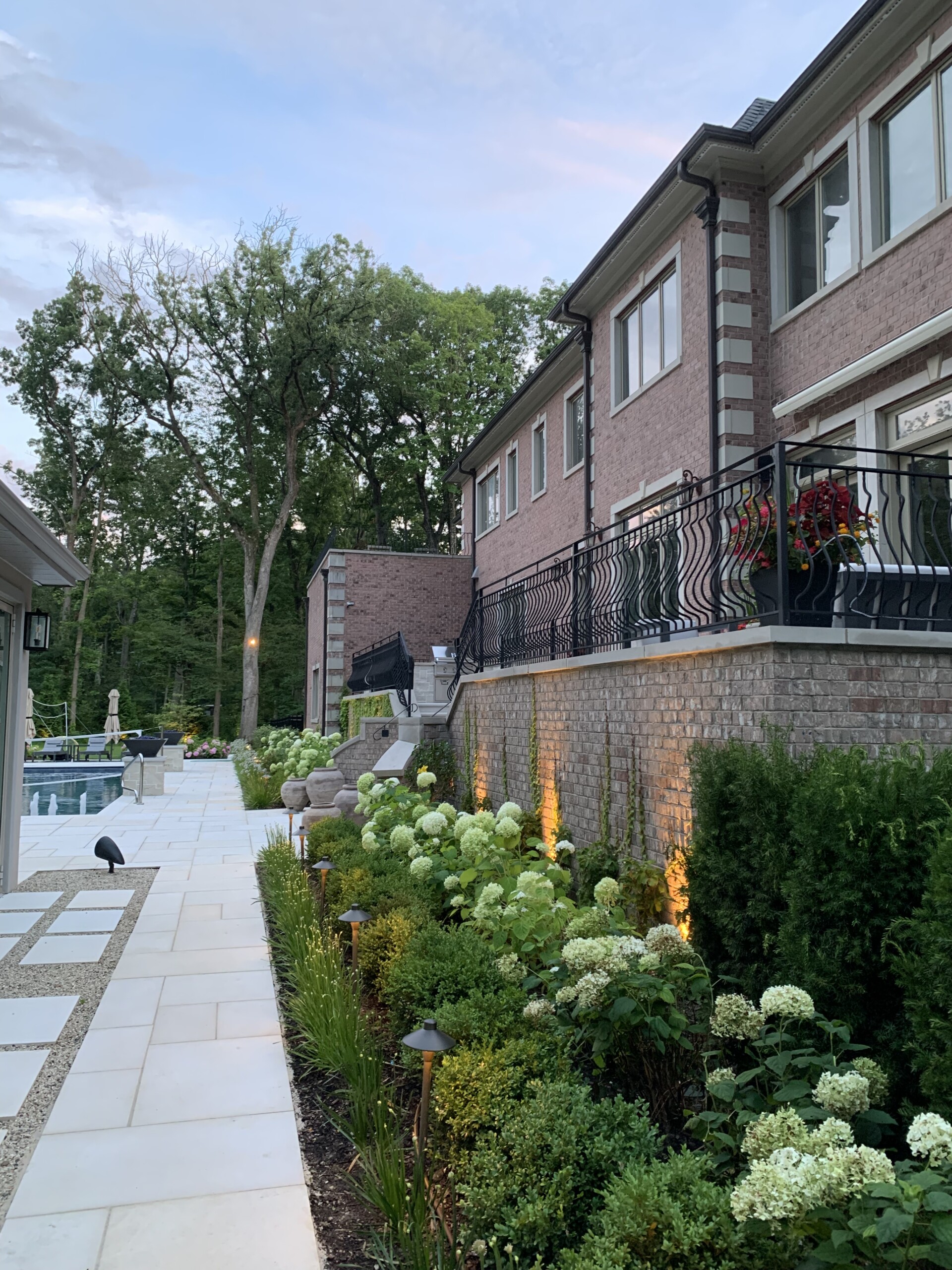 A great landscape design is only complete with the right finishing touches. We installed vibrant floral borders, oversized stone planters, and strategic LED lighting to highlight the home’s masonry and the texture of the white hydrangeas. This project also features a lush green lawn optimized for family activities like volleyball, proving that elite landscape design can be both beautiful and functional. Our comprehensive approach ensures your property looks just as magical under the moonlight as it does at noon.