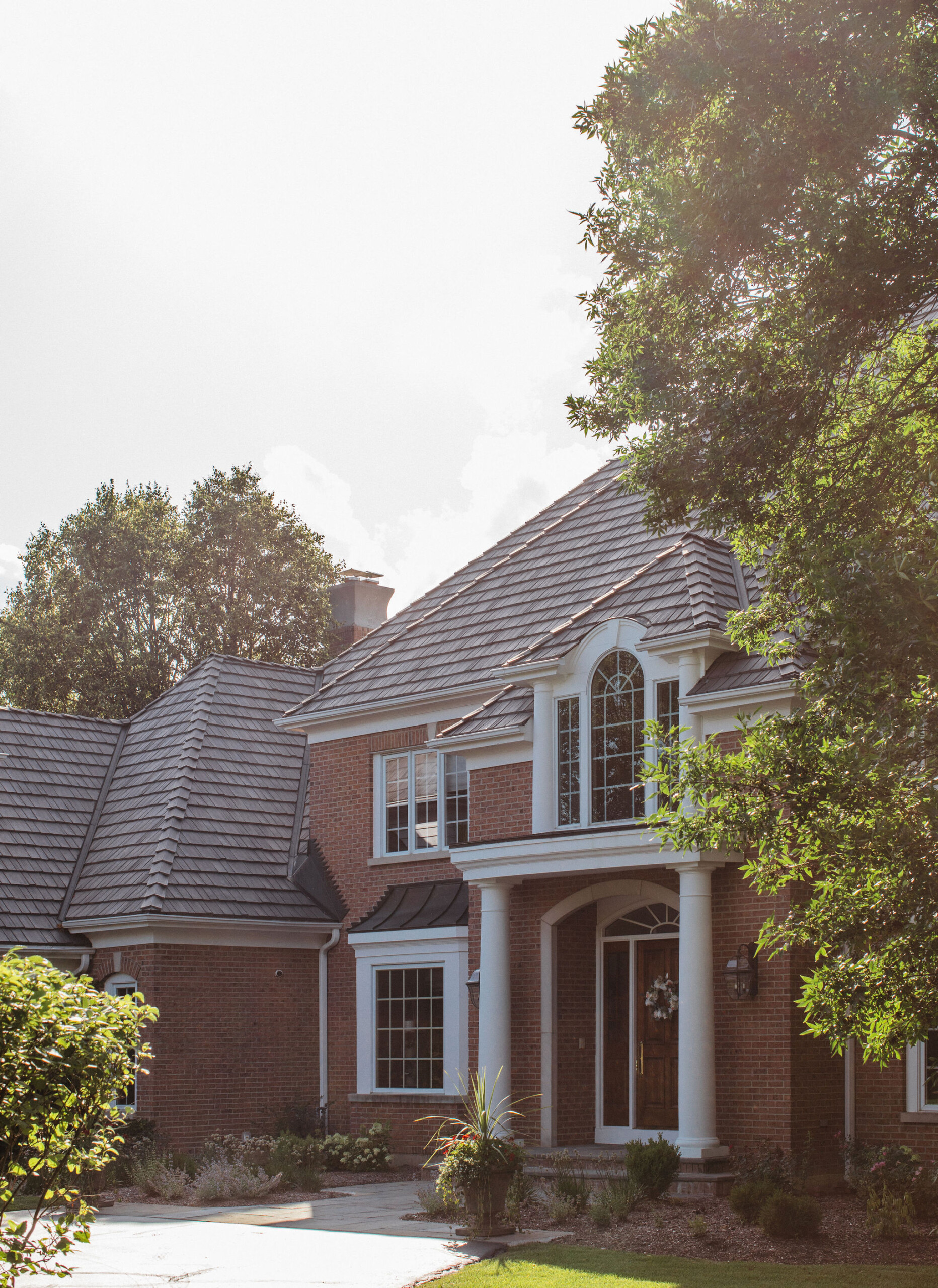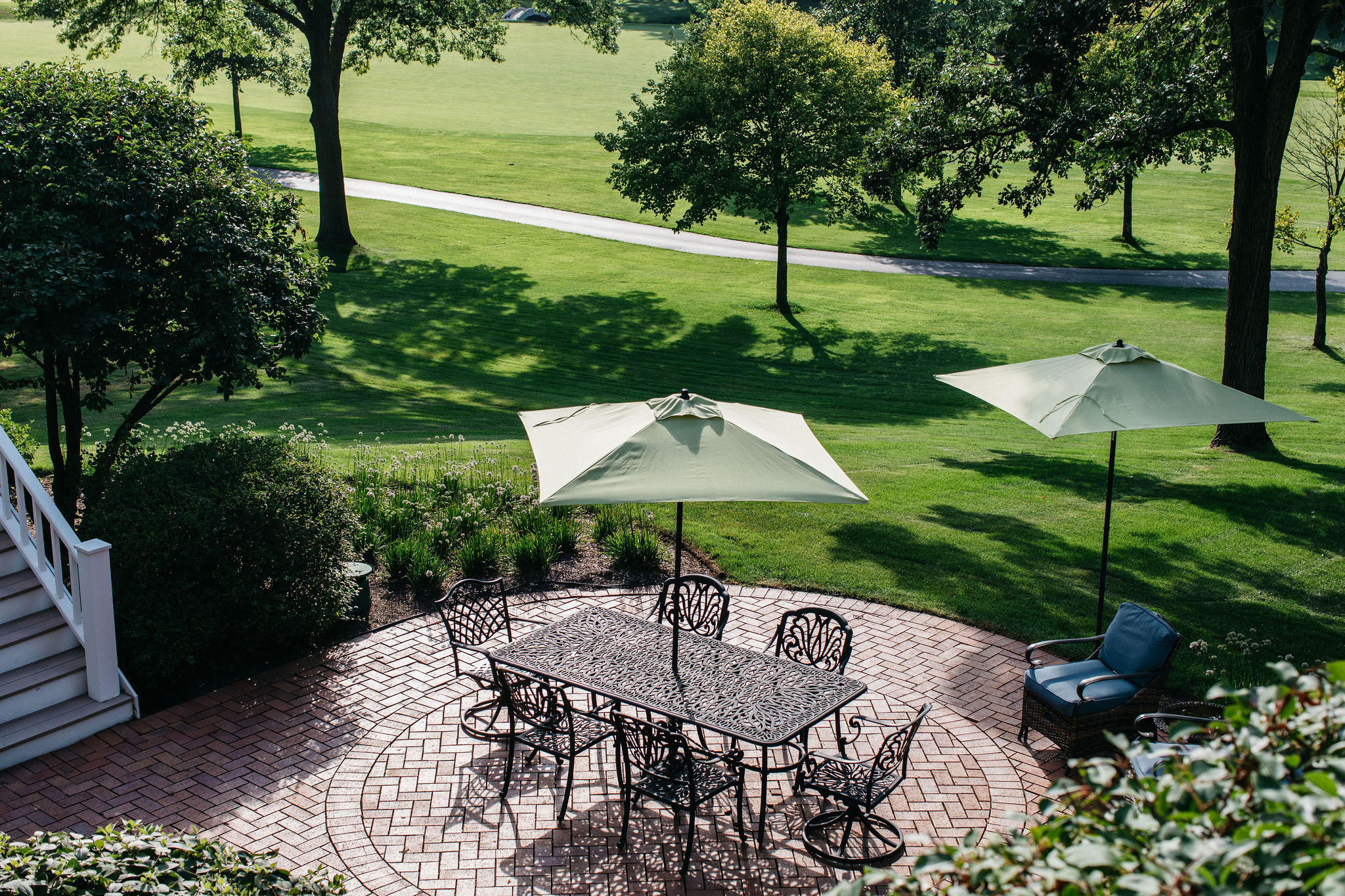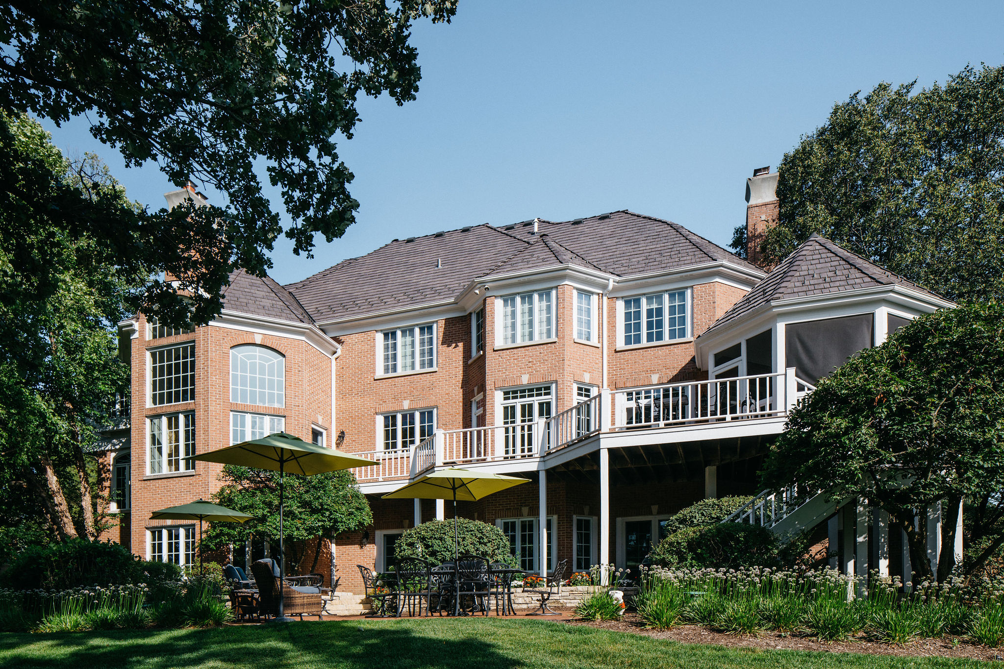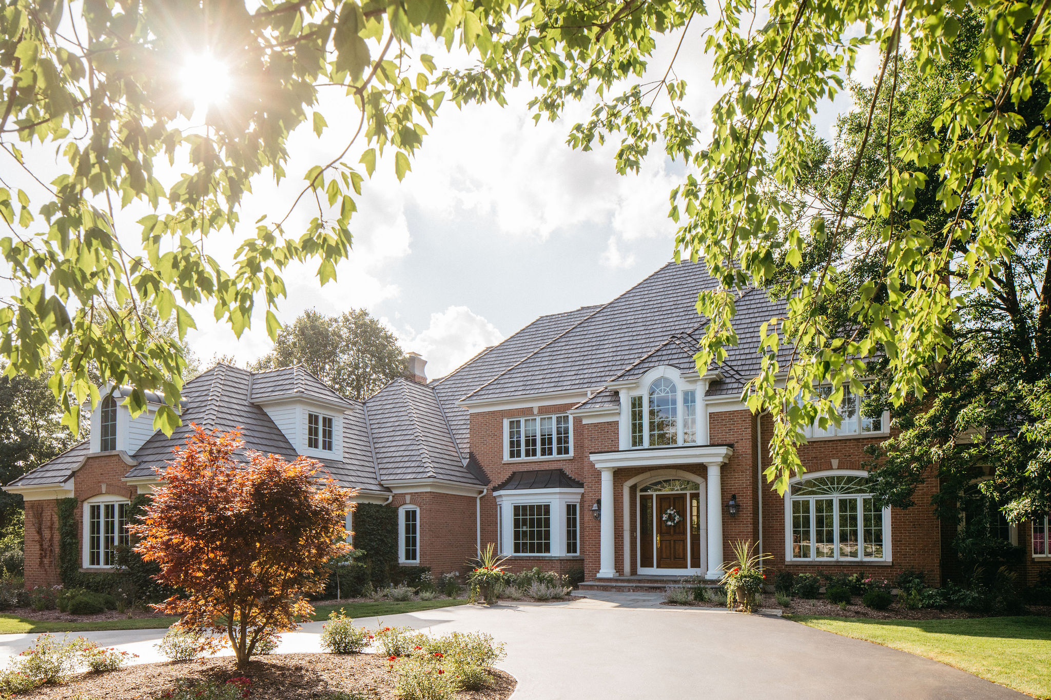 Beyond the newly defined gathering spaces, this landscape was designed for cohesive beauty and maximum functionality. Carefully chosen plantings within the garden beds and the unique driveway feature provide layered texture and vibrant color, substantially boosting the property’s curb appeal. Given the scale of the home, our work often involves ensuring proper grading and drainage to protect the foundation and the long-term health of the lawn. The result is a truly elevated outdoor environment that provides a welcoming first impression and a luxurious sanctuary for the homeowners to enjoy.