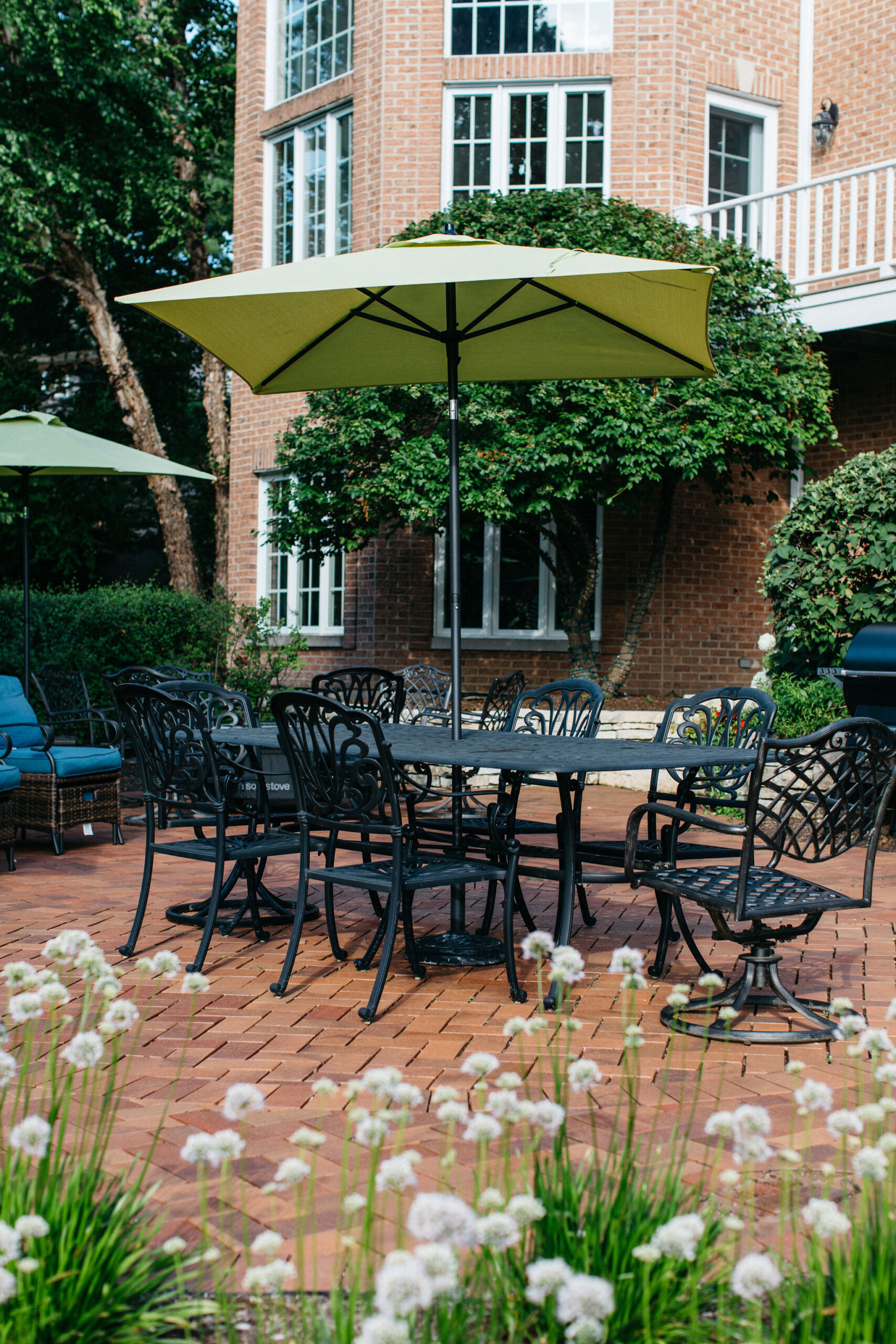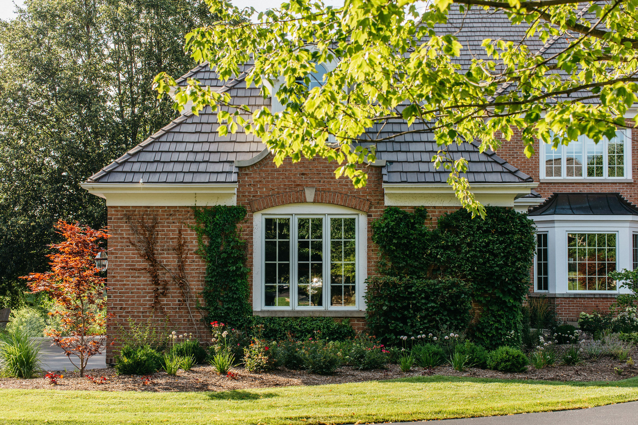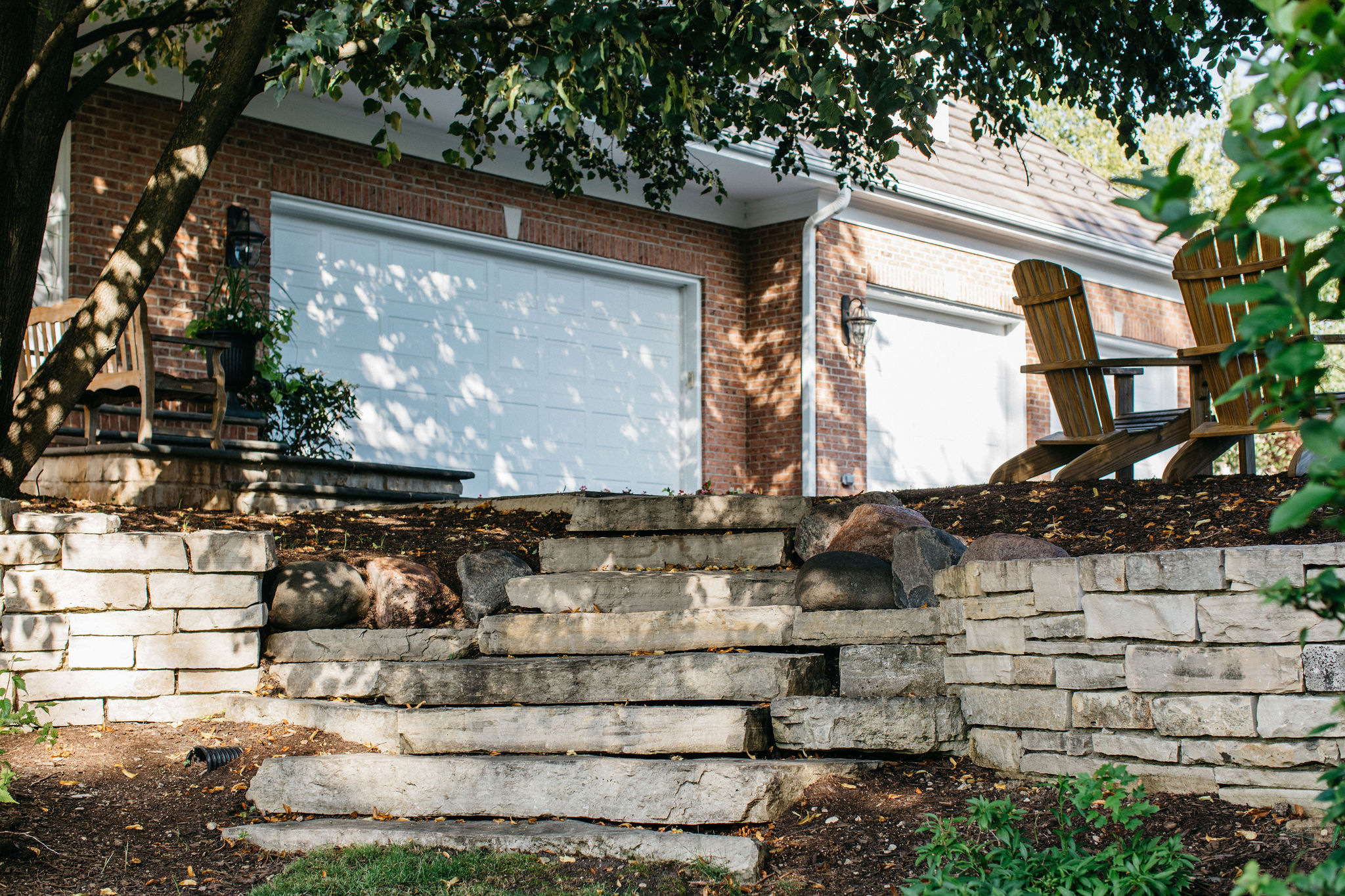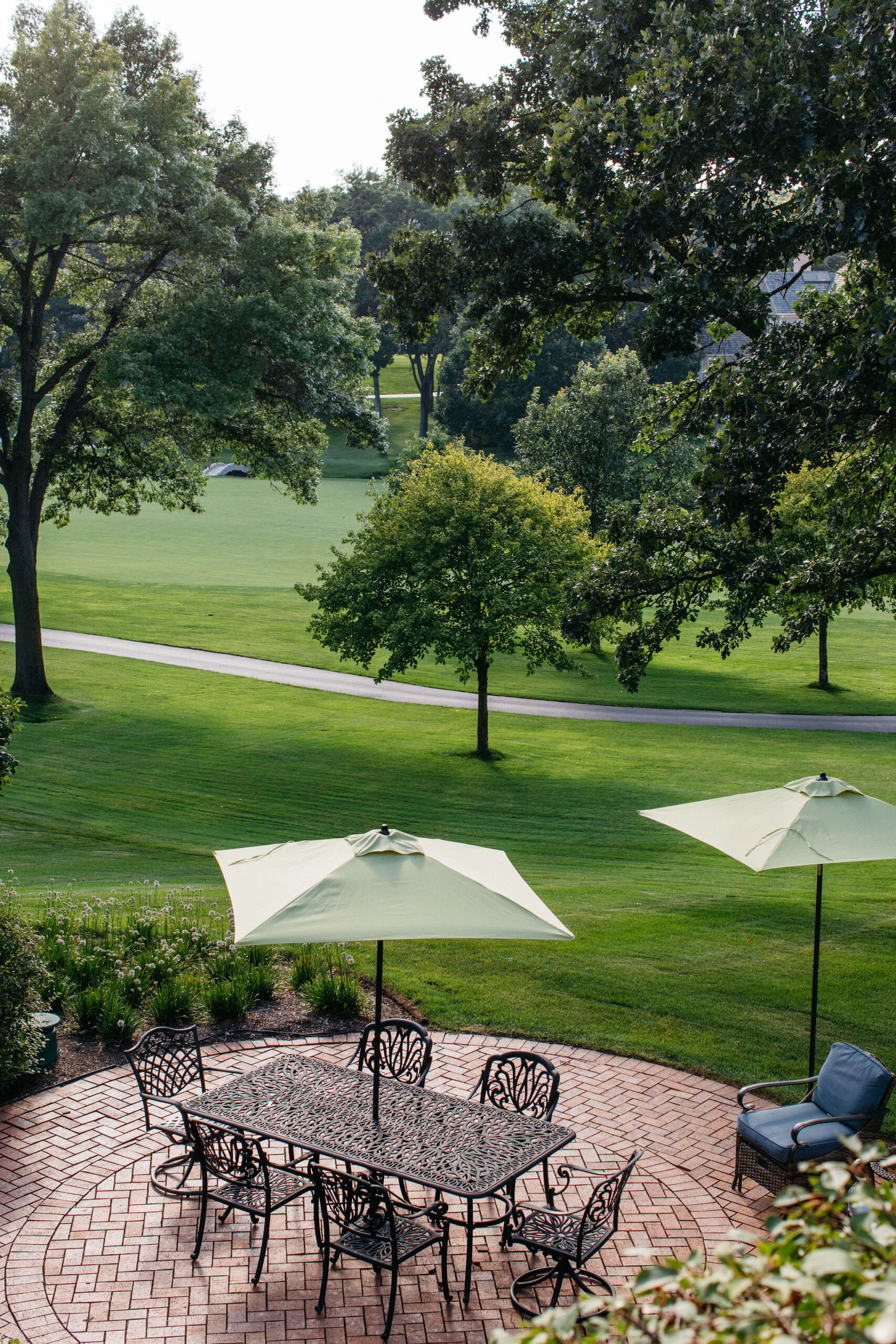 Beyond the newly defined gathering spaces, this landscape was designed for cohesive beauty and maximum functionality. Carefully chosen plantings within the garden beds and the unique driveway feature provide layered texture and vibrant color, substantially boosting the property’s curb appeal. Given the scale of the home, our work often involves ensuring proper grading and drainage to protect the foundation and the long-term health of the lawn. The result is a truly elevated outdoor environment that provides a welcoming first impression and a luxurious sanctuary for the homeowners to enjoy.